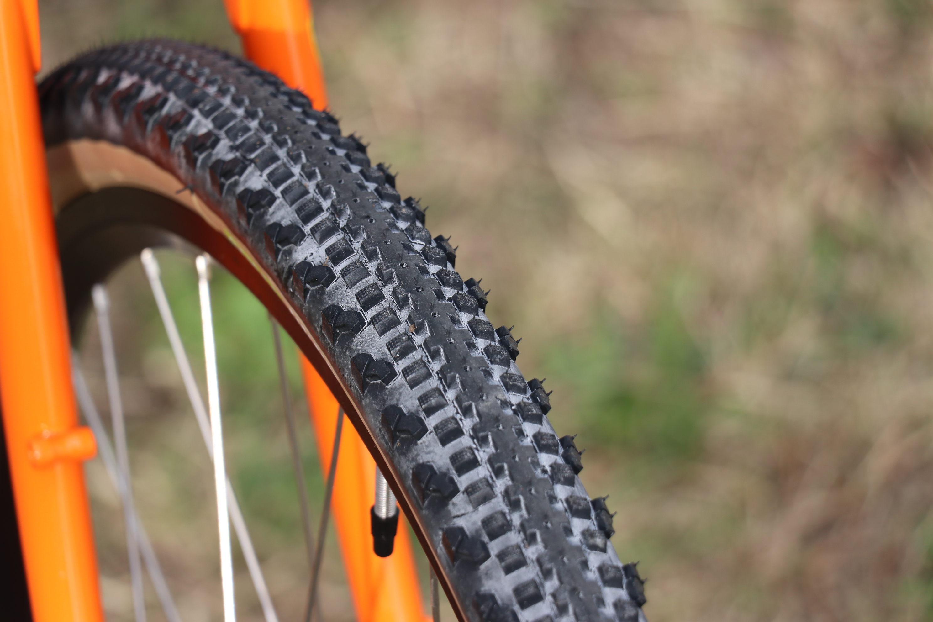 センター部は連結されたノブパターンでアスファルトの転がりを軽く、かつ中腹~サイドにかけては間隔をあけた低めのノブパターンで林道などのグリップ力を向上させている、今回のコンセプトにおいては実にバランスの良いデザイン。