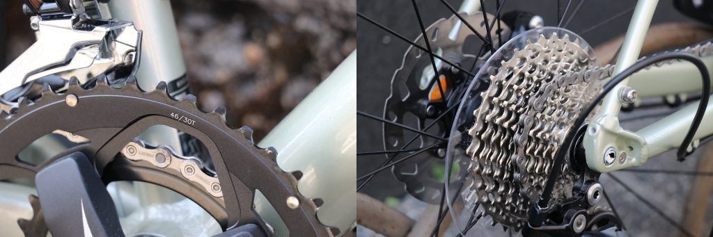 BROAMの場合はフロントがコンパクトな46/30t、リアは11-36tとなっているので最小のギア比は0.83!京都の北の方でもちょくちょく出てくる滑りやすい砂利の敷かれた激坂も、シッティングでトラクションを確保しながら軽いギア比でグイグイ登れますね!