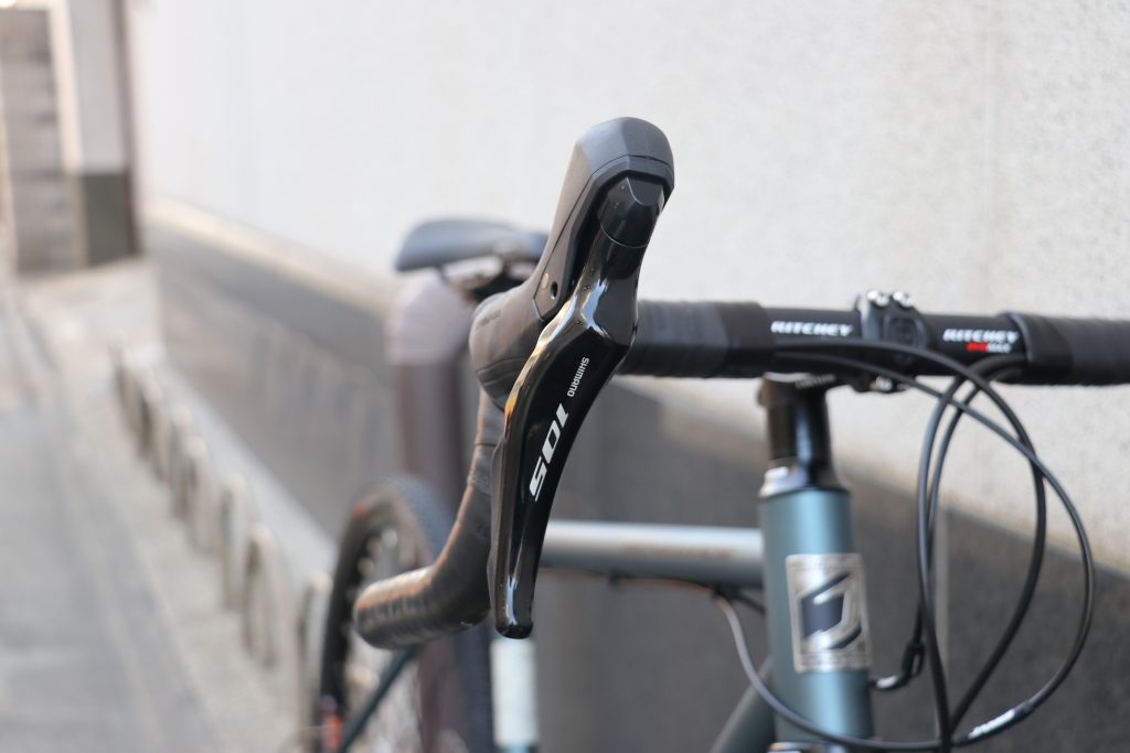 油圧ディスクブレーキによる高い制動力は昨年から変わらずですが、新型105になった事で『コンパクトかつ握りやすいレバー形状』『よりワイドなギア比を使用可能なディレイラー』と特にグラベルロードにはもってこい!