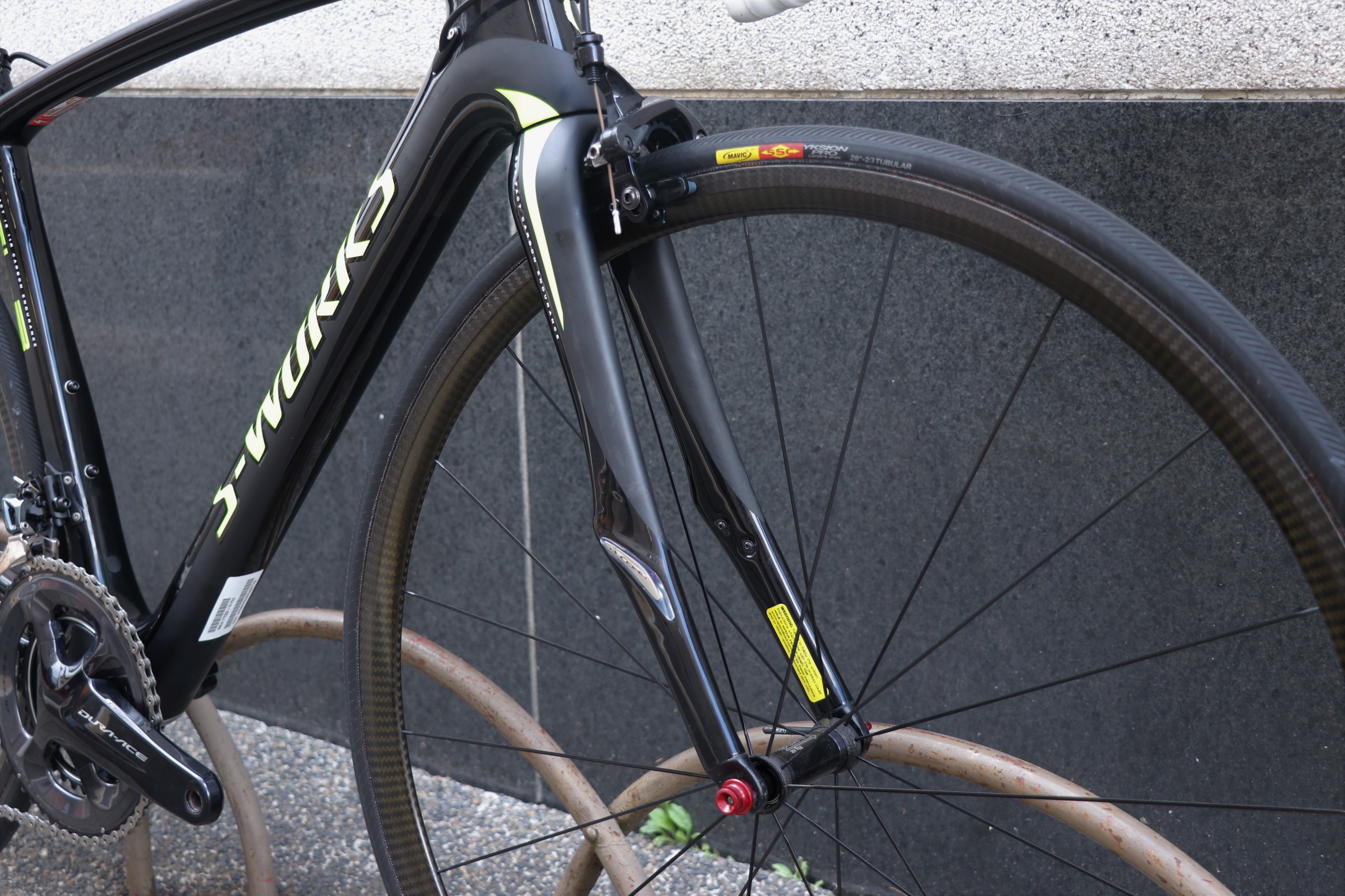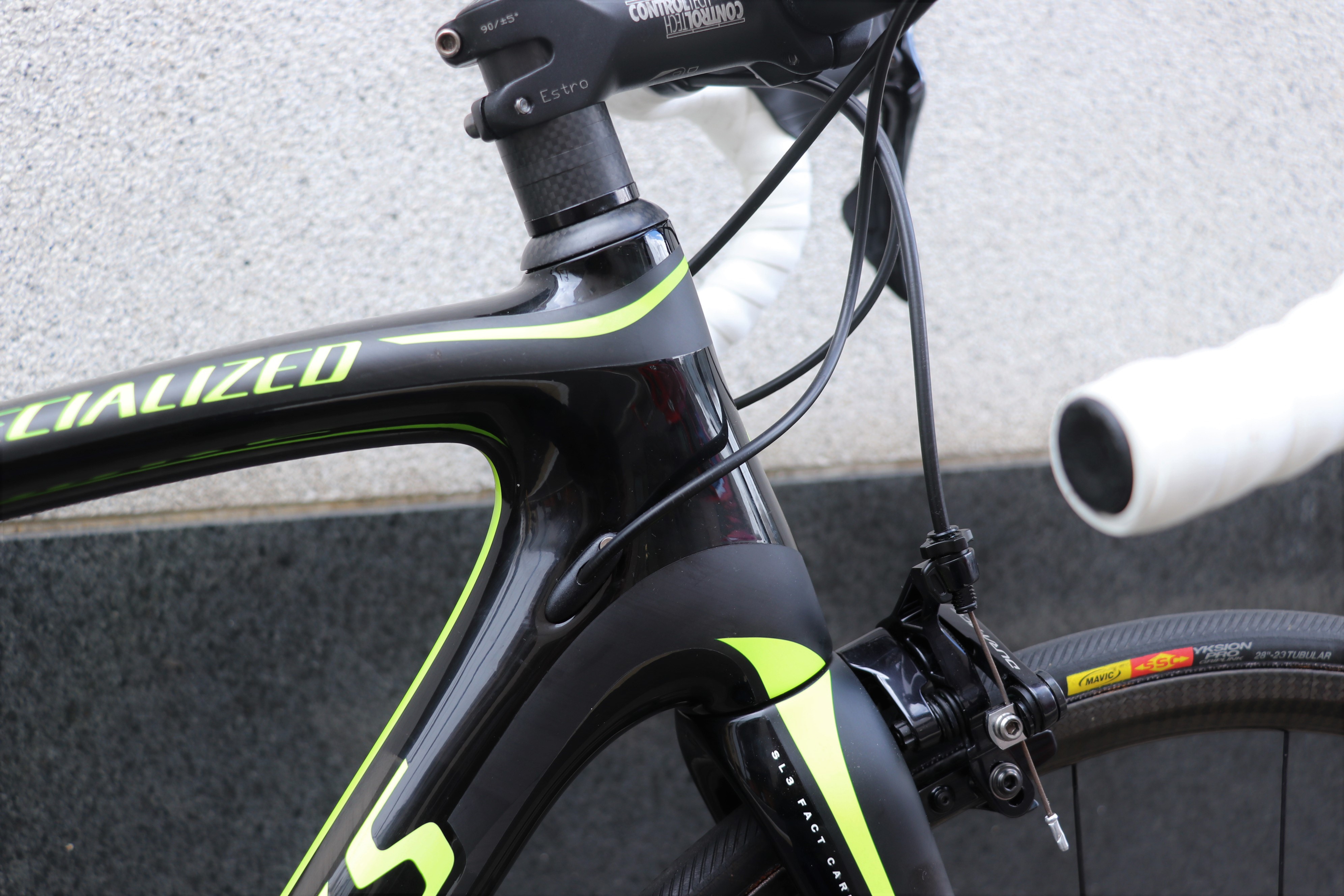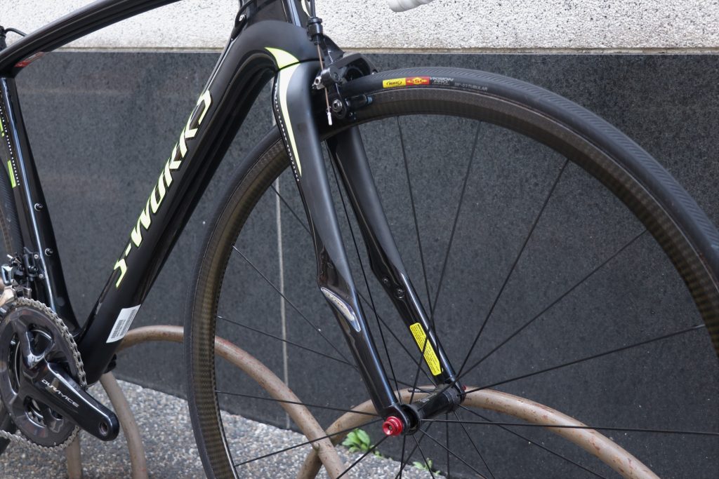 | スペック | フレーム | S-Works FACT 11r carbon, FACT IS construction, uniquley shaped tapered 1-1/8″ to 1-3/8″ head tube, compact race design w/ Zertz inserts, internal cable routing, carbon OSBB |