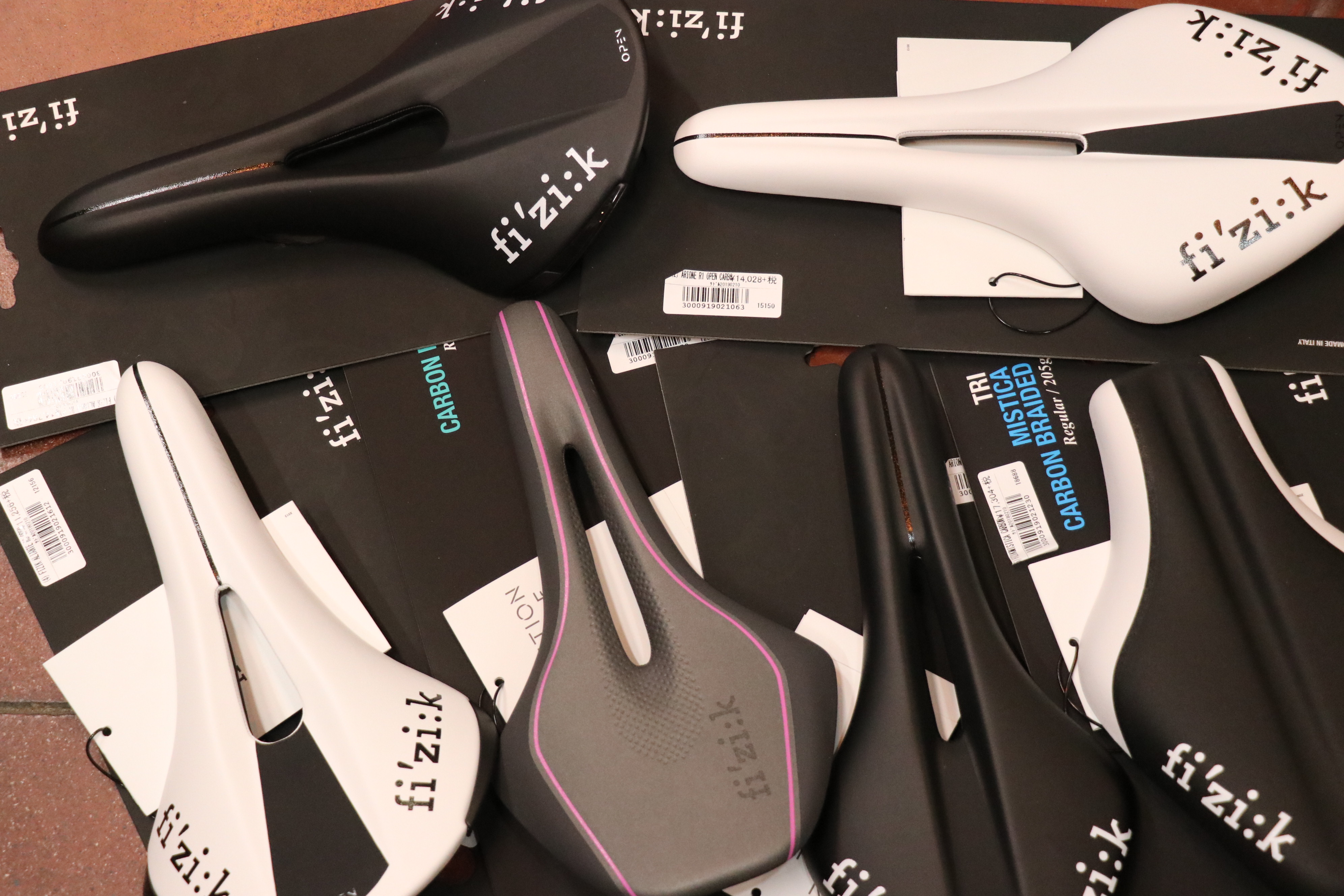 サドルもかなり豪華なラインナップ。定番ロードモデルのALIANTE/ARIONEのOPEN=穴あきモデルやちょっと珍しくTTサドルもご用意。