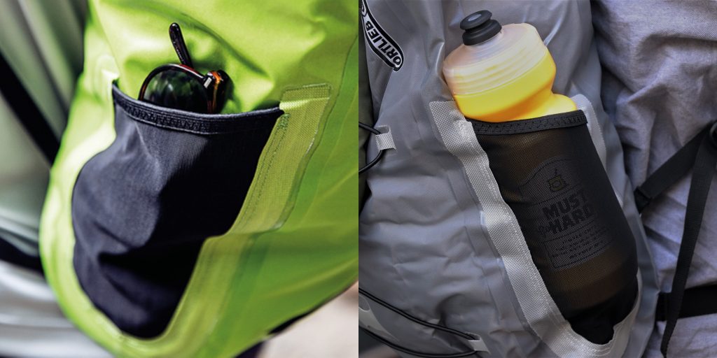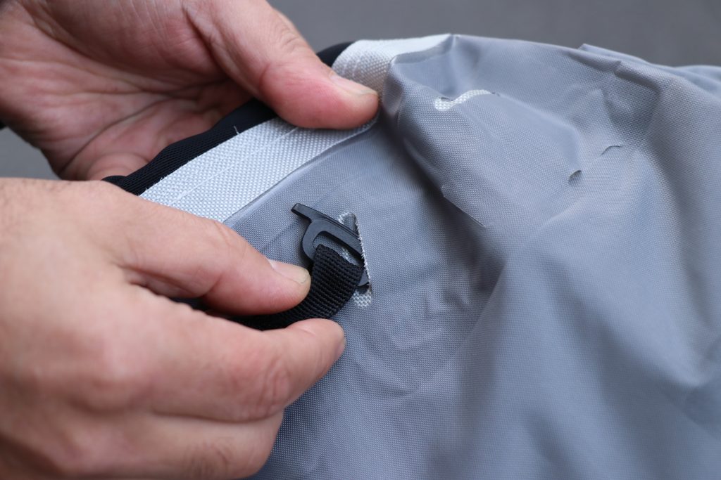 濡れたレインウェアやシューズ、ヘルメットなど、バッグ内から溢れた様々な荷物を括り付けれます。