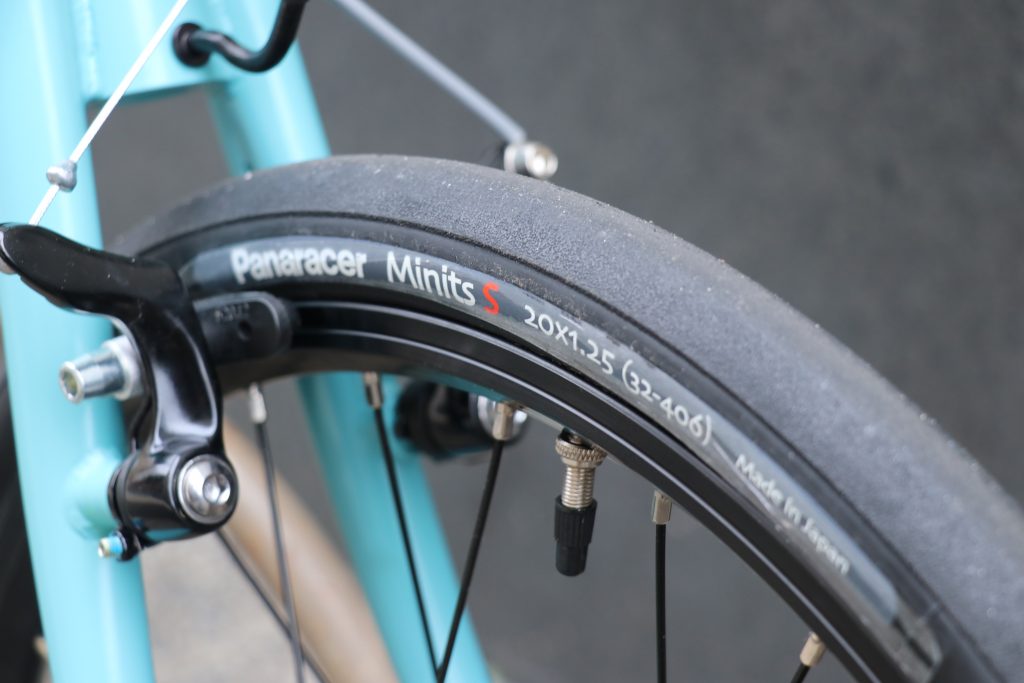 タイヤには、日本製パナレーサーのMINITS S 20×1.25インチ幅が採用。32mm程のタイヤ幅で転がり軽く、フレームの乗り味との相性も良し。