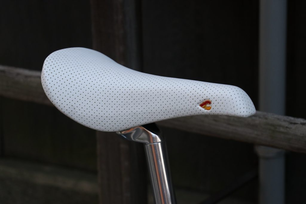 車体全体の印象に大きく影響するサドルにはホワイトのパンチングとロゴプレートがステキな【CINELLI/チネリ】VOLARE を。