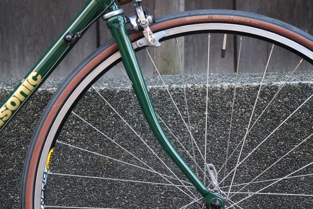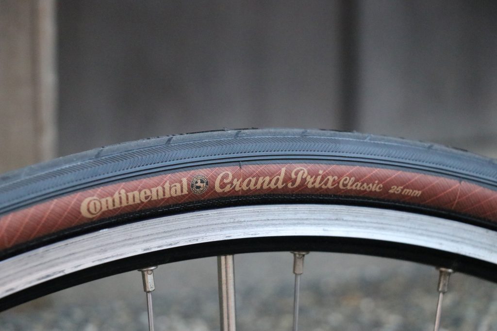 タイヤには、ポリXブレーカー内蔵でカットパンクにも強くサイドのカラーが実に渋いCONTINENTAL GRAND PRIX CLASSIC 700x25C。