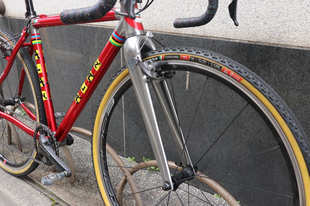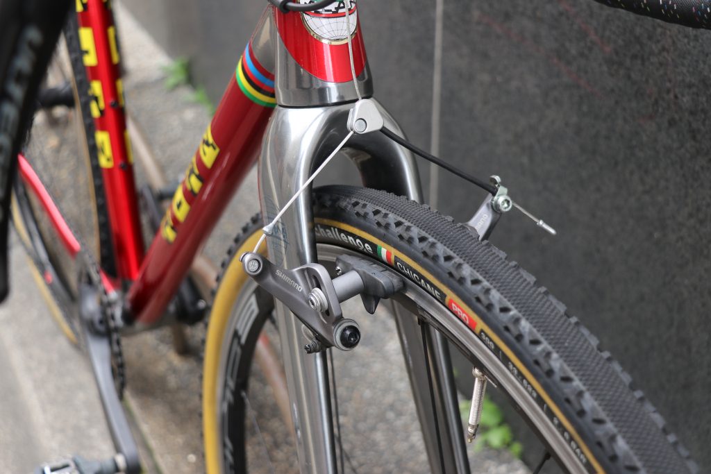カンチブレーキというクラシカルな規格に相反して、テーパーヘッド規格採用フルカーボンフォークというモダンな構成。