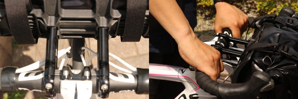 これなら、タイヤ⇔ハンドル間の距離が近い、フレームサイズ小さめ /ヘッドチューブ短めの自転車でもバッチリ取り付け出来ますね!