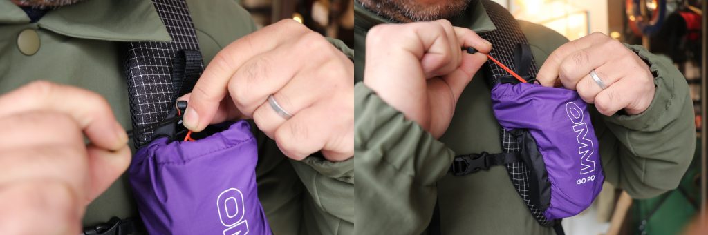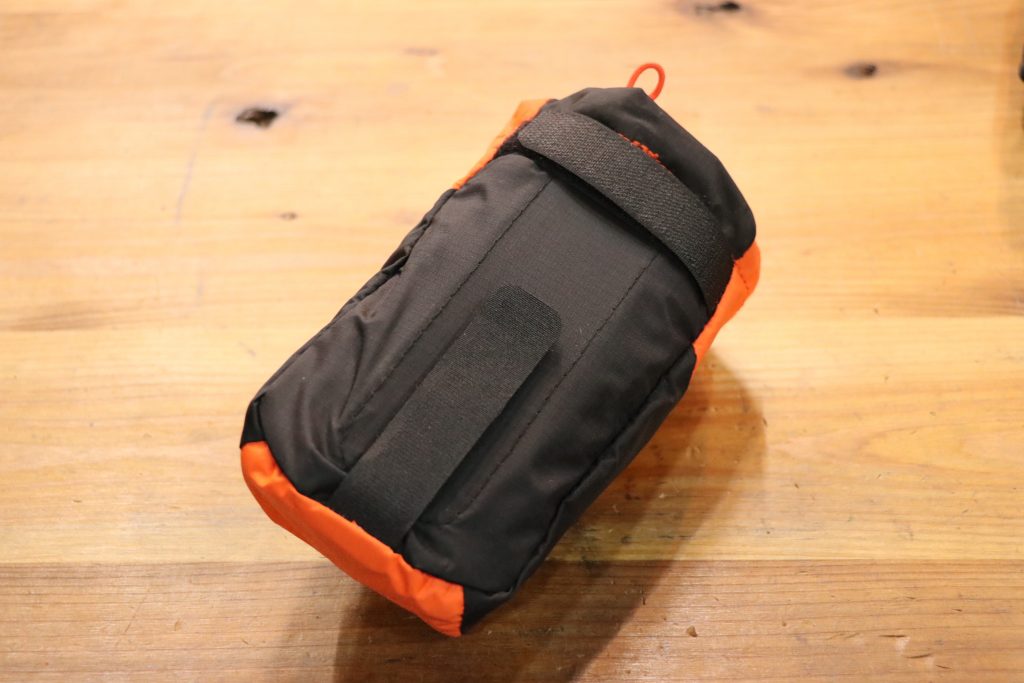 ポーチには2種類のコードが配されており、黒い方は口を巾着の様に絞る物/オレンジの方はポーチ全体にコンプレッションをかけるという物。