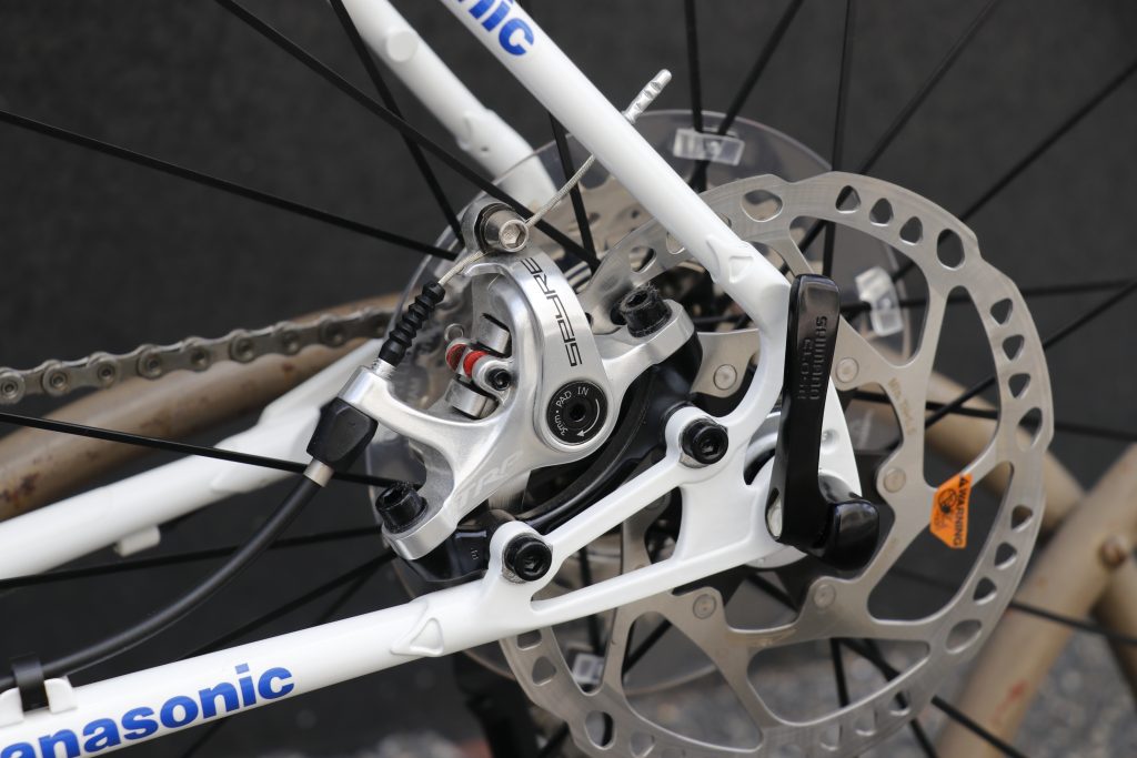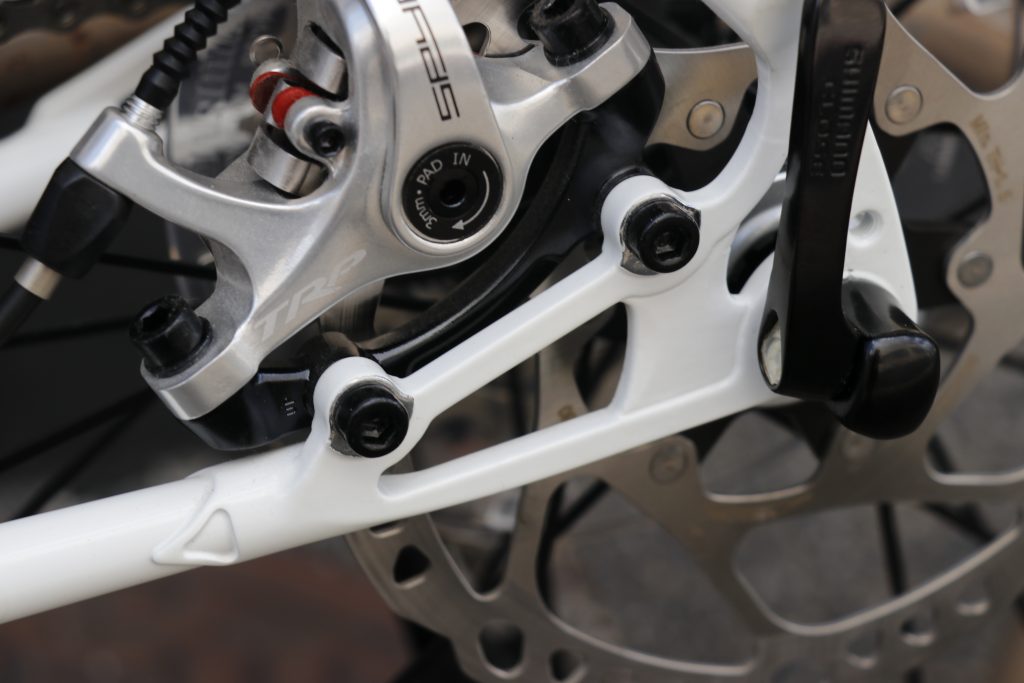 ブレーキは機械式ではカッチリしたブレーキタッチで好評のTRP SPYREを用意。対向ピストンによる動作の軽さは確実に使いやすく、ディスクローターも歪みにくいので便利ですね◎