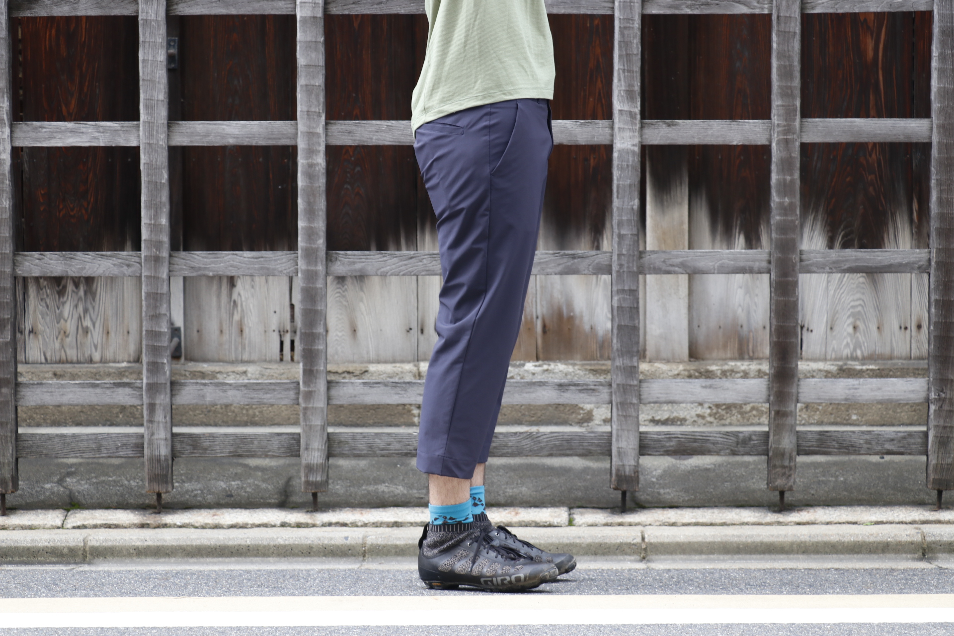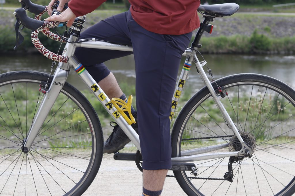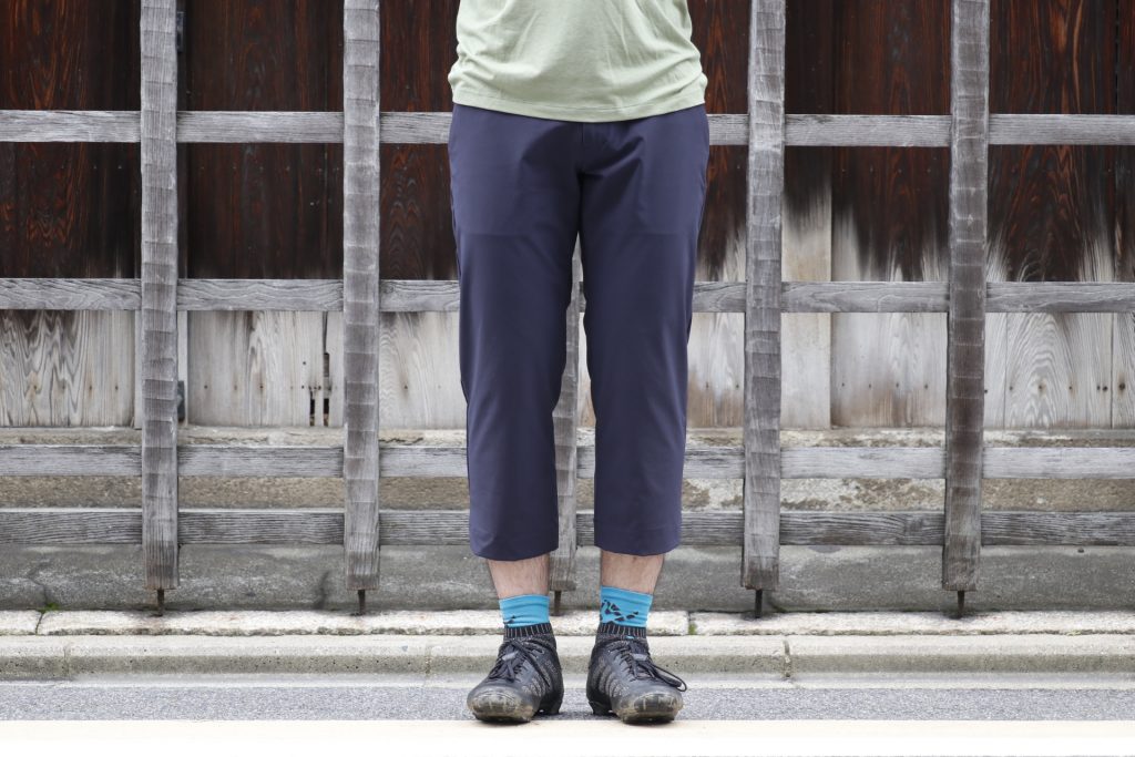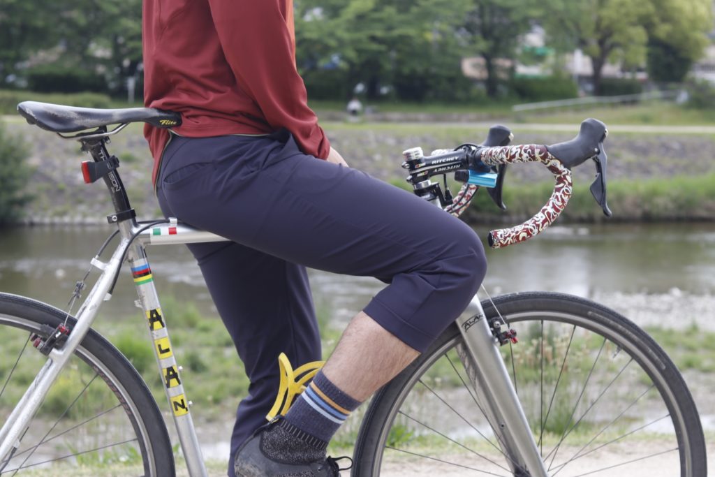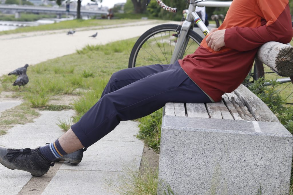 サイクリング後の賀茂川でコーヒーを一杯的なリラックスタイムにも嬉しい、サラッとした肌触りが履いていて気持ち良い本パンツ。