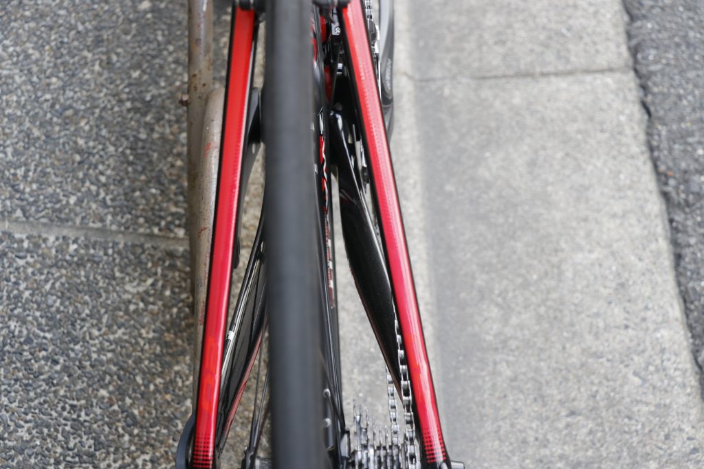 リアバックは一見オーソドックスですが、シートステーが極細ということもなく、高速域やヒルクライムでの大パワーもしっかりと受け止めて進んでくれる印象。