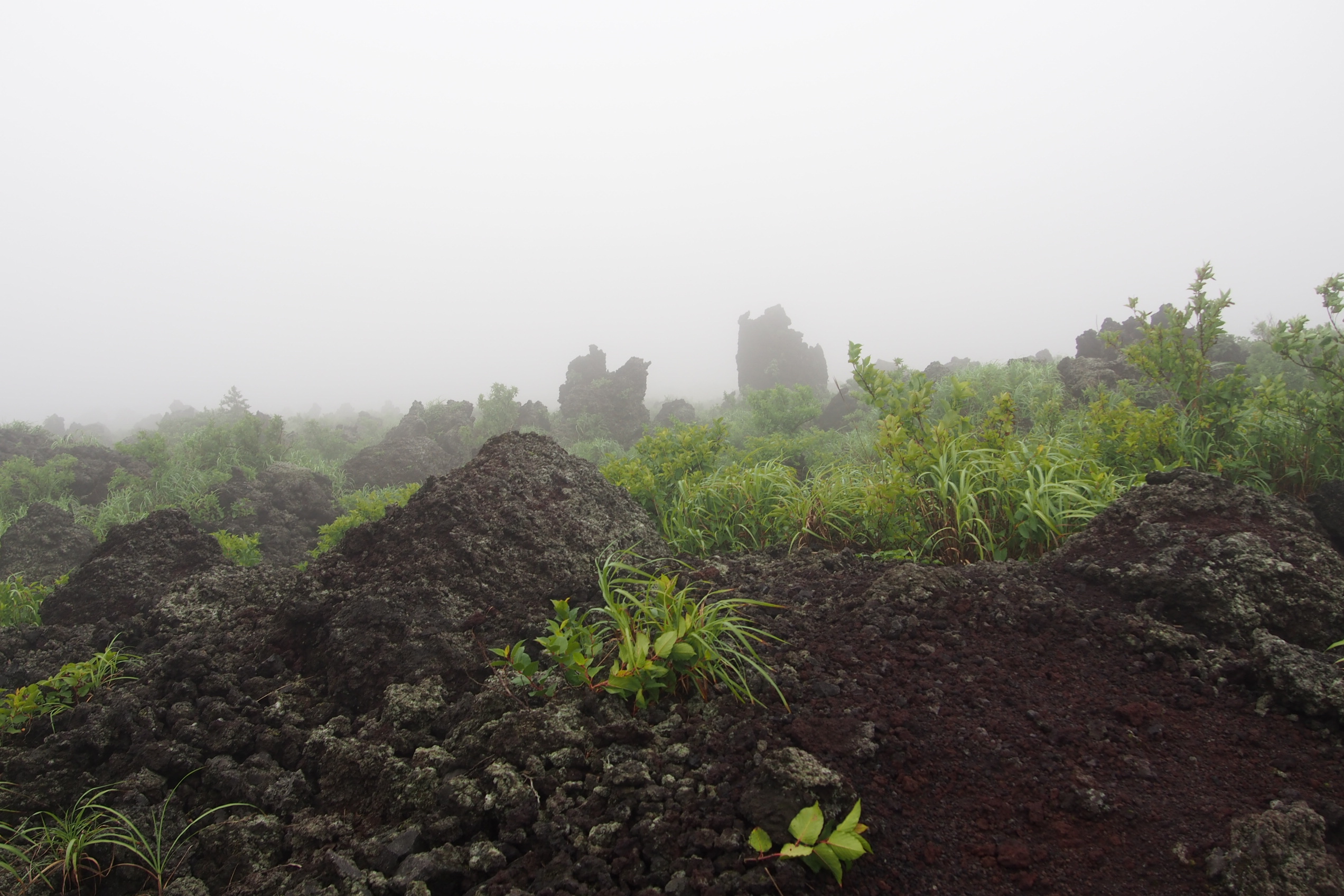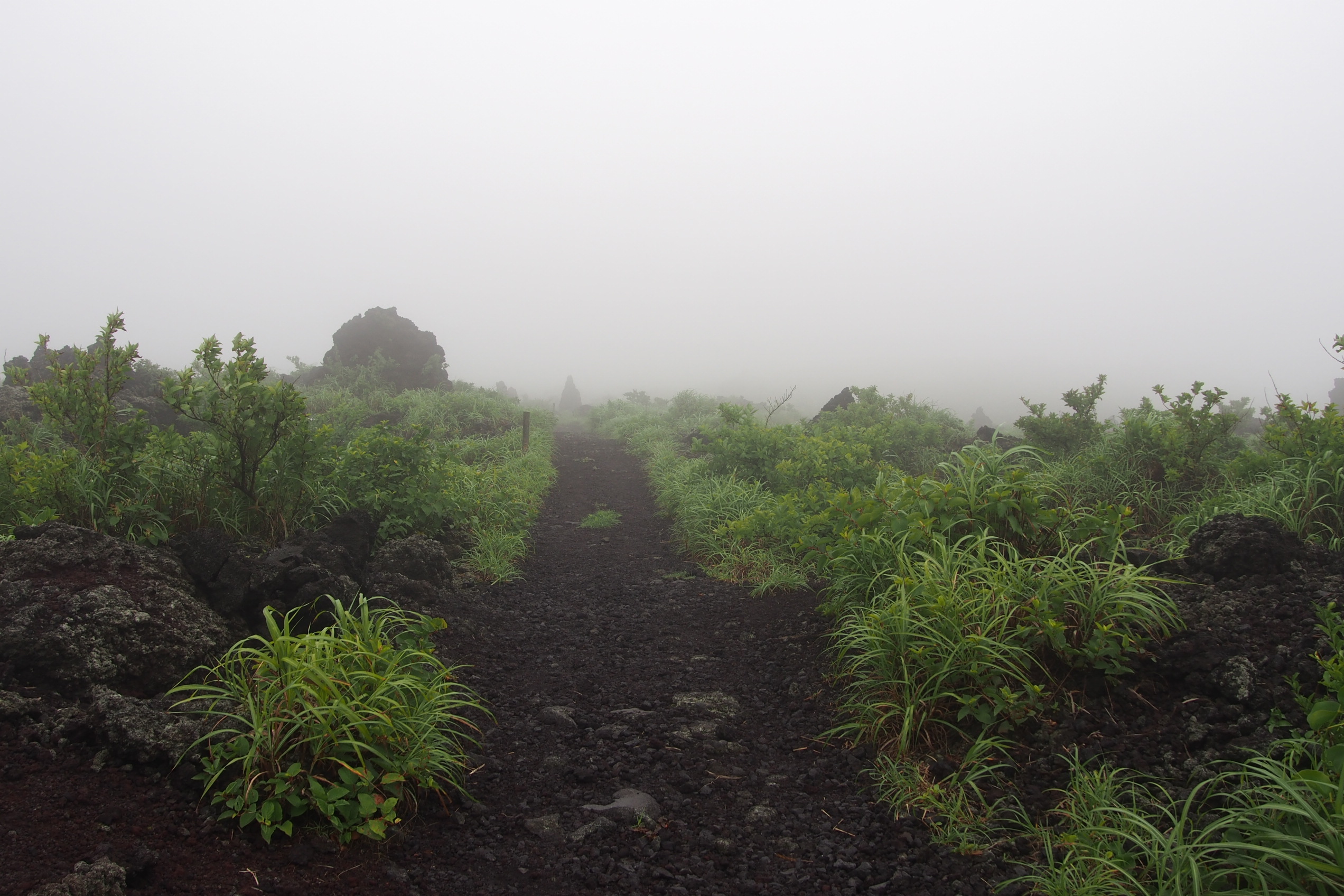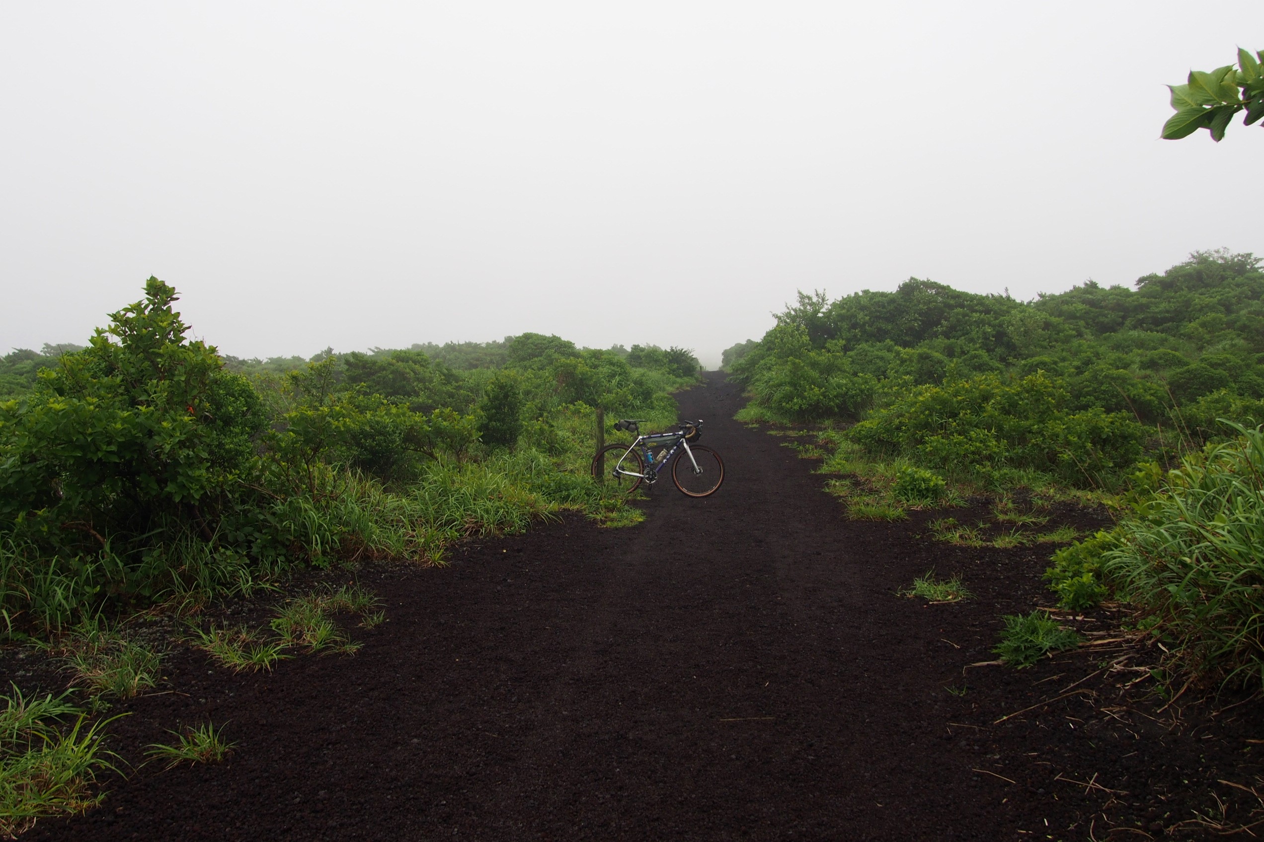 見渡す限り黒い砂利道(軽石(火山石))と低い植物。