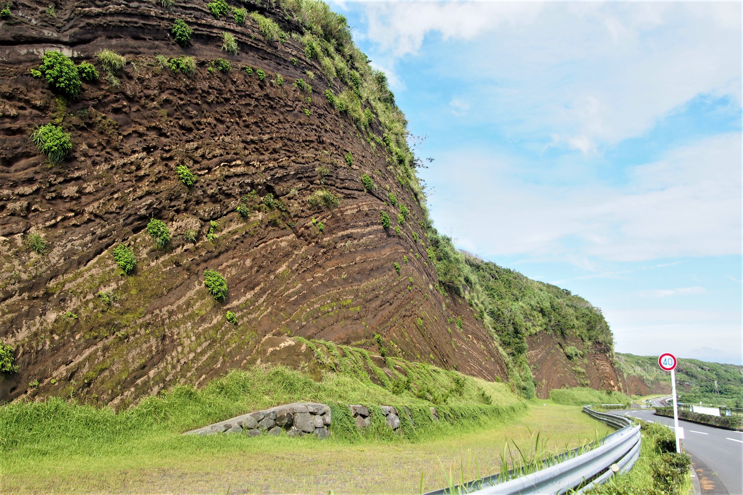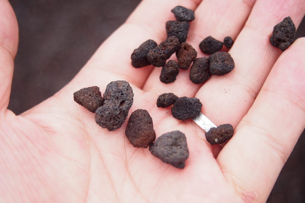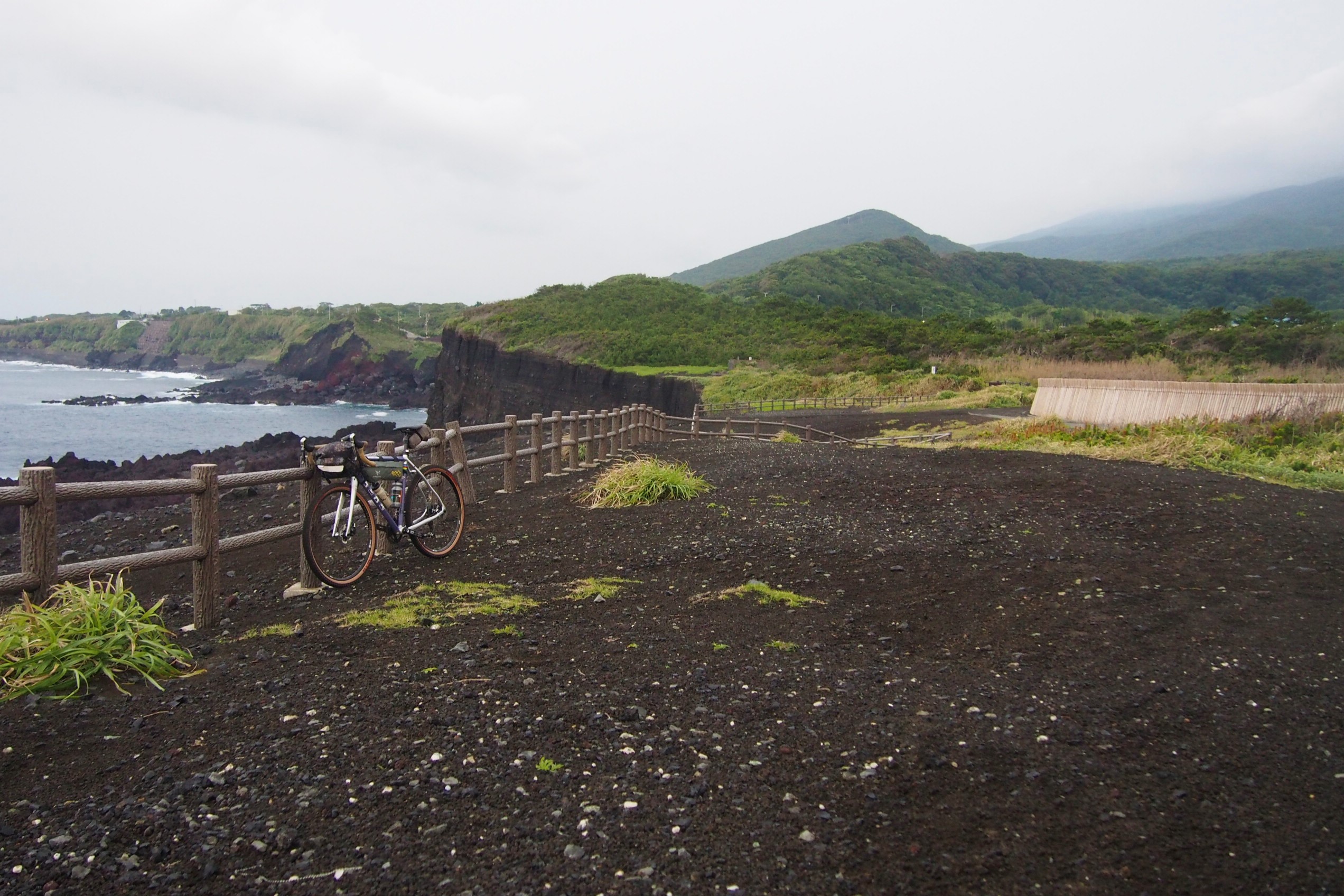 見渡す限り黒い砂利道(軽石(火山石))と低い植物。