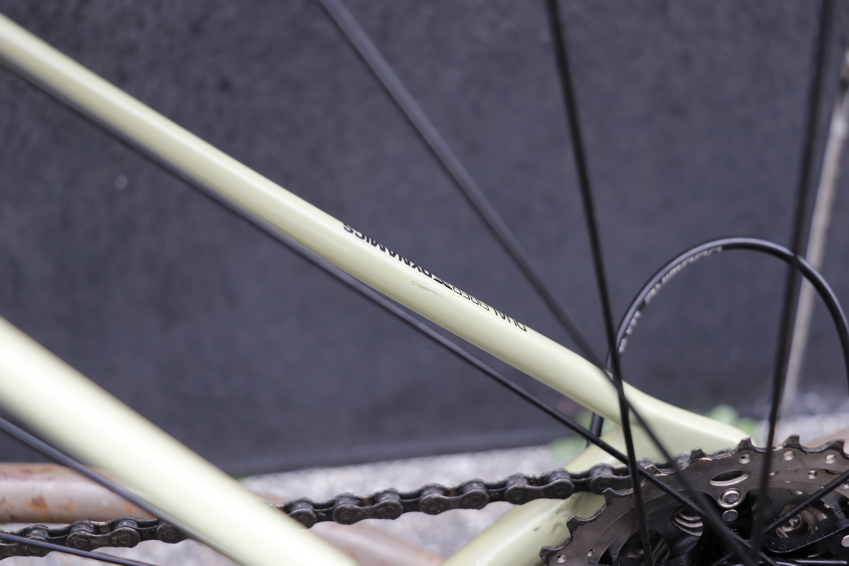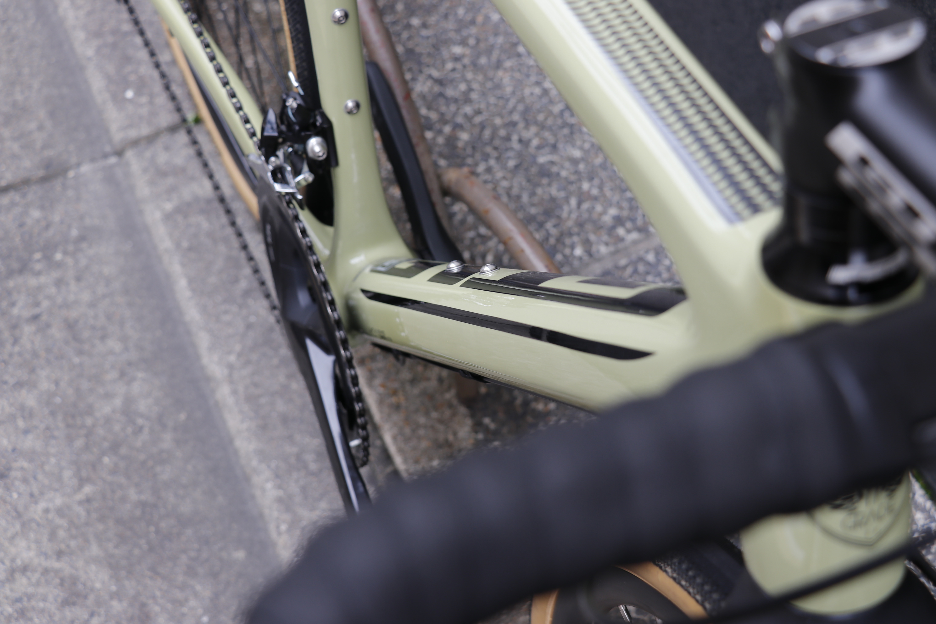 対照的にダウンチューブはスクエア形状でガッシリした印象。ペダリングのロスは生みません。