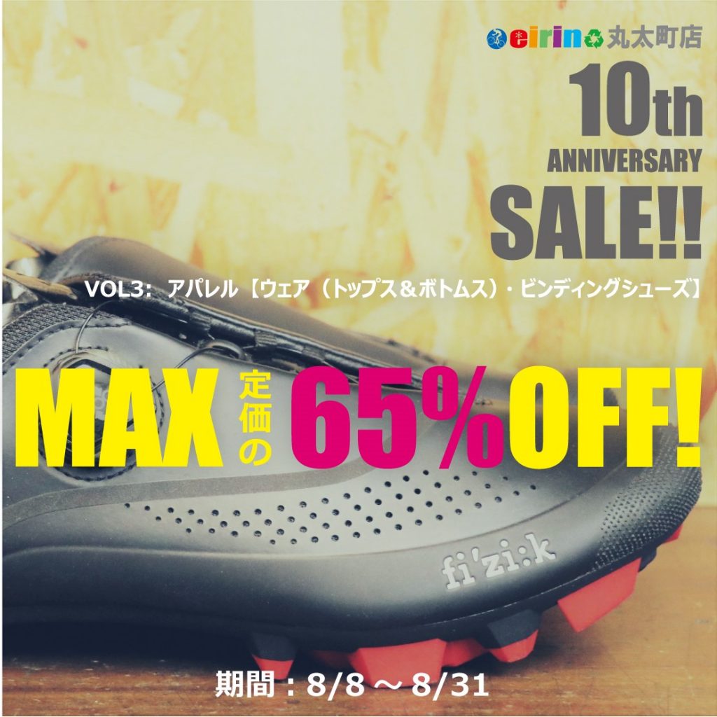 【サイクルショップeirin丸太町店 オープン10周年記念 第三段】 期間限定(*2019年8/31まで!)最大定価の65%OFF!!セール★~アパレル(ウェア&シューズ)~ のご案内!
