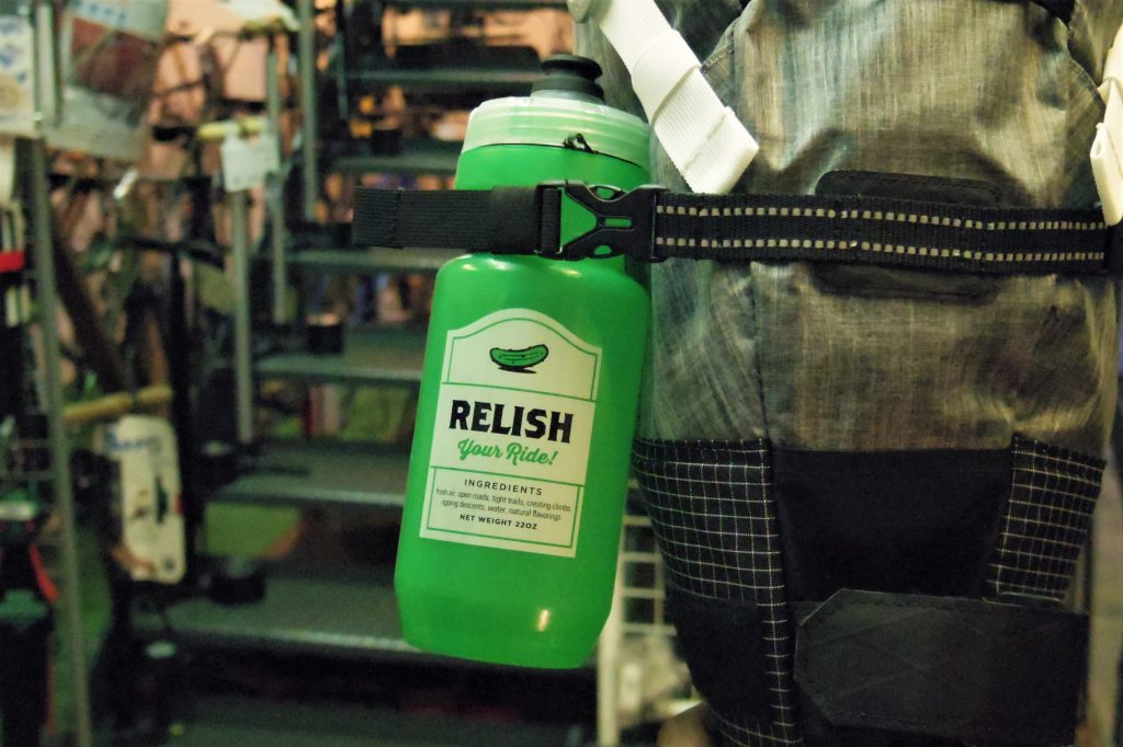 ちょっと裏技?的にバックパック時には使わない、サドルレールマウントのストラップを使って左右にサイクリングボトルも収納可能◎