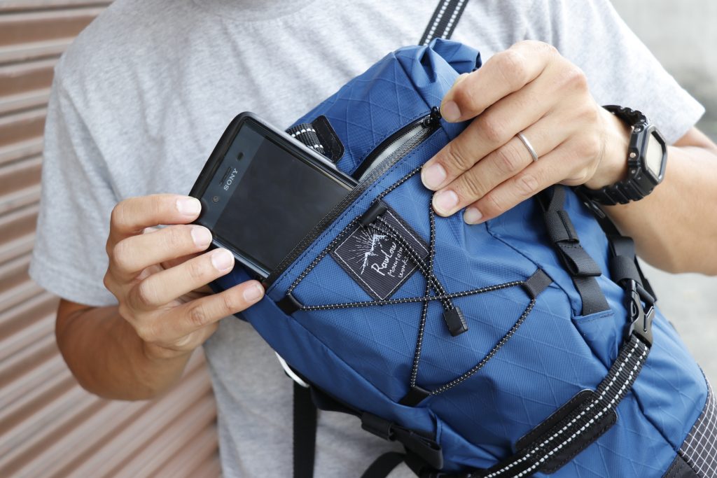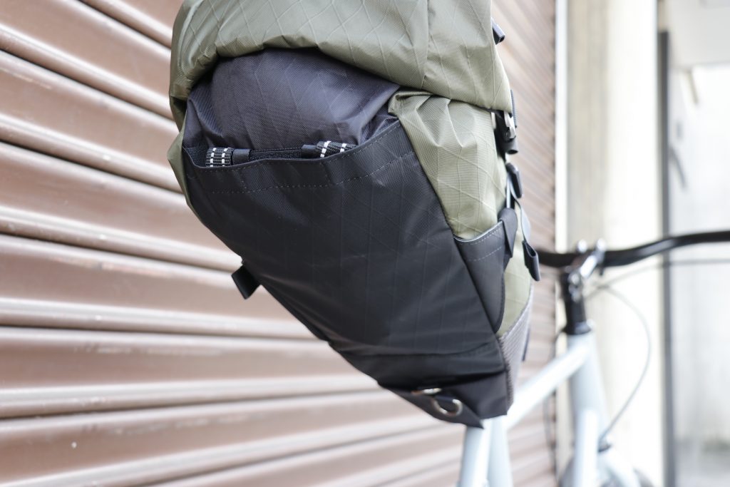 上部にはスマホが入る程度のジップポケットとレインウェアなど、中に入れたくない荷物の収納に便利なバンジーコード付き。
