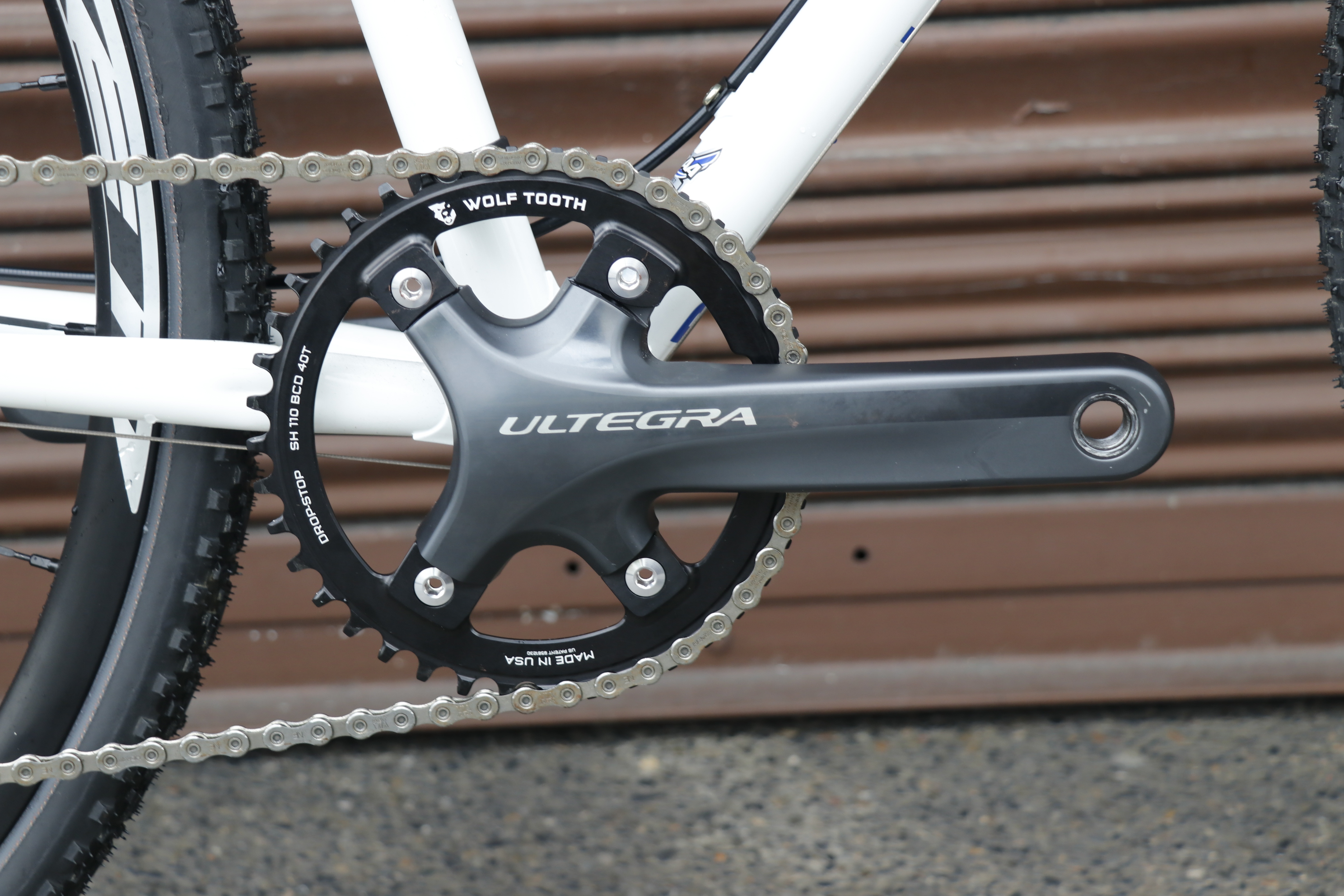 チェーンリングはフロントシングルでは間違いないWOLFTOOTHを。元々のULTEGRAクランクを使いコスト抑えつつも機能的に使いやすくカスタム◎