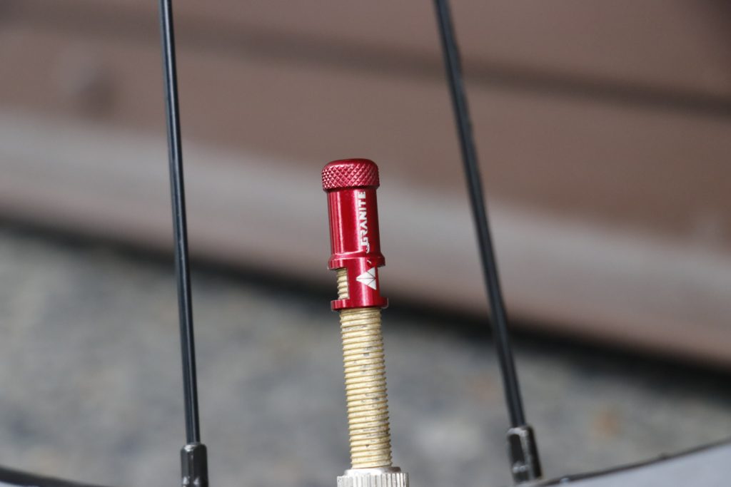 もちろん、セッティングはチューブレスで◎チューブレスあるあるなバルブコアの緩みもGRANITEのコアリムーバー付きバルブキャップで心配なしです!