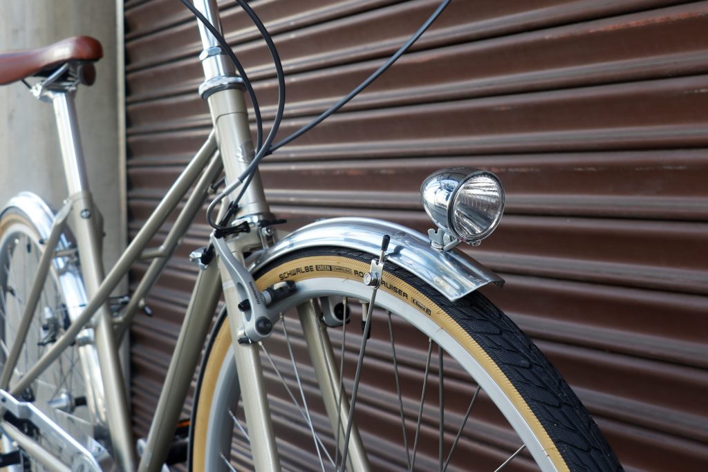 ●夜間自動で点灯するハブダイナモ&前フェンダー上に設置されたメッキ仕上砲弾ライト。ダイナモコードは、フォークブレードに内蔵され、端正なプロムナードの外観を損なわない工夫が施されています。
