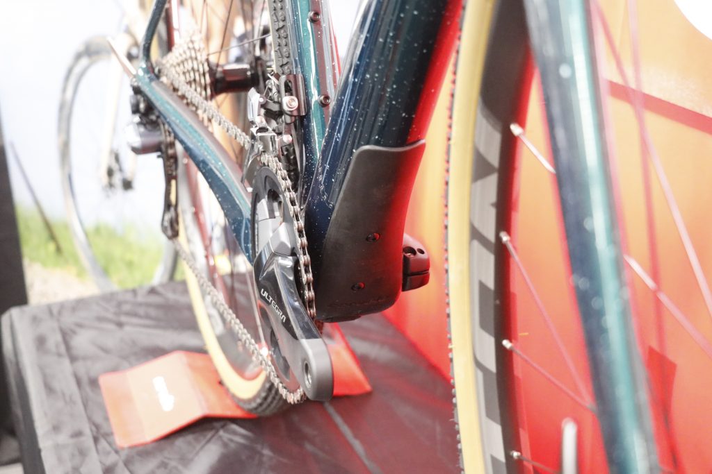 ダウンチューブ下のプロテクターにはDI2バッテリーが固定出来る台座が用意されているとの事。