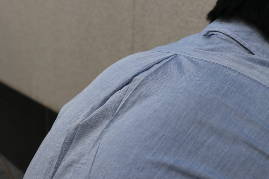 身幅やアームホールの広さなどの細かなサイズ調整や、ヨークの高さやダーツの取り方など、シャツ自体のパターンそのものですべての動きやすさを実現しています。