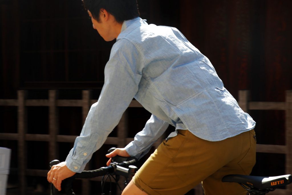 自転車に乗る際に適した機能性を持つ普段着の定番「シャンブレーシャツ」
