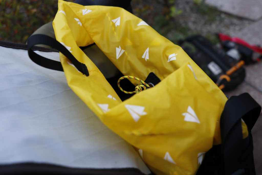 開閉するイエローの60Dシルナイロン製巾着部分は、コラボレーションとなる「PAPERSKY」の飛行機ロゴを散りばめたモノグラム風に。