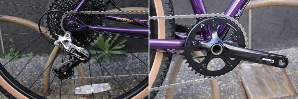 SRAMならではの高いチェーンテンションはダートコース時での振動からチェーン外れを防いでくれますし、11-42Tスプロケットは登りも楽々で安心◎