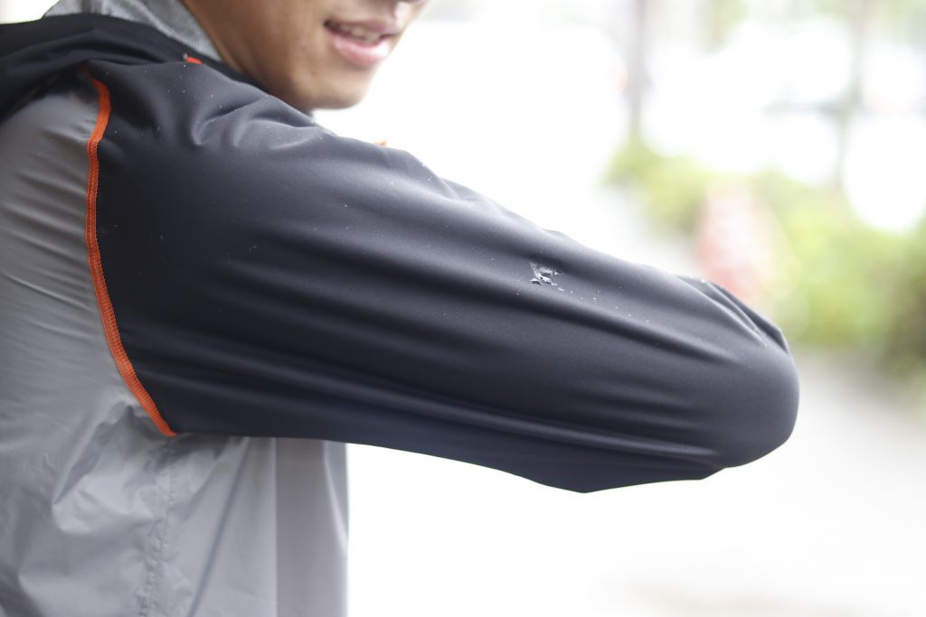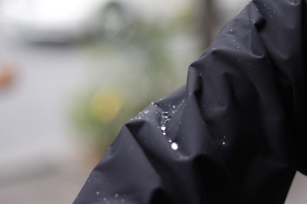 この通りしっかりと水を弾いてくれながらも、運動にともなう汗蒸れはしっかり外に放出してくれる高機能素材。
