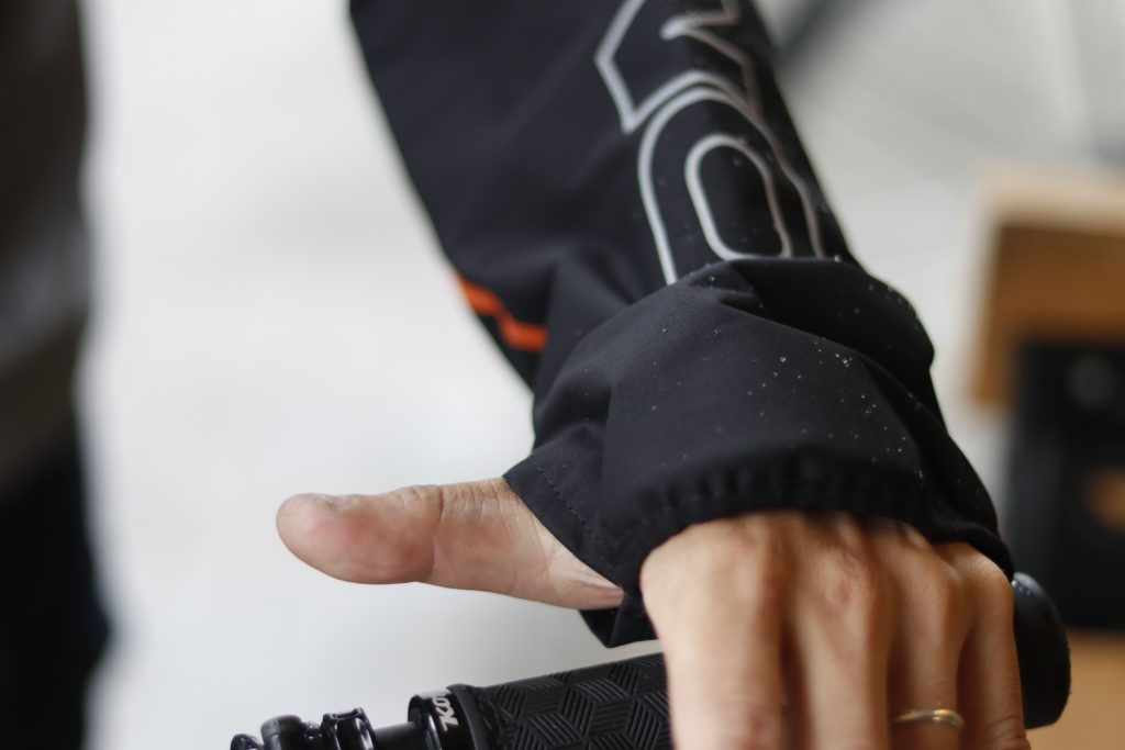サムホール付きの袖口は、手首や手の甲を保護し、雨水の侵入を防ぎます。