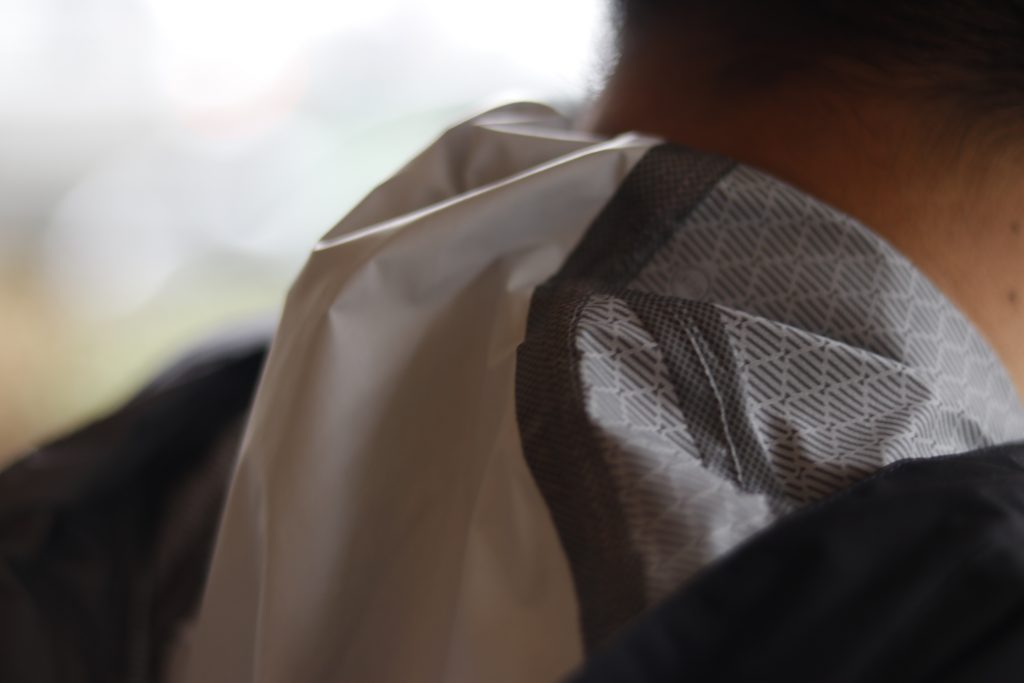 フードサイド~ショルダー~腕にかけて、運動性高い部分はこのようにストレッチ性高いKamleika with 37.5ファブリック が採用。