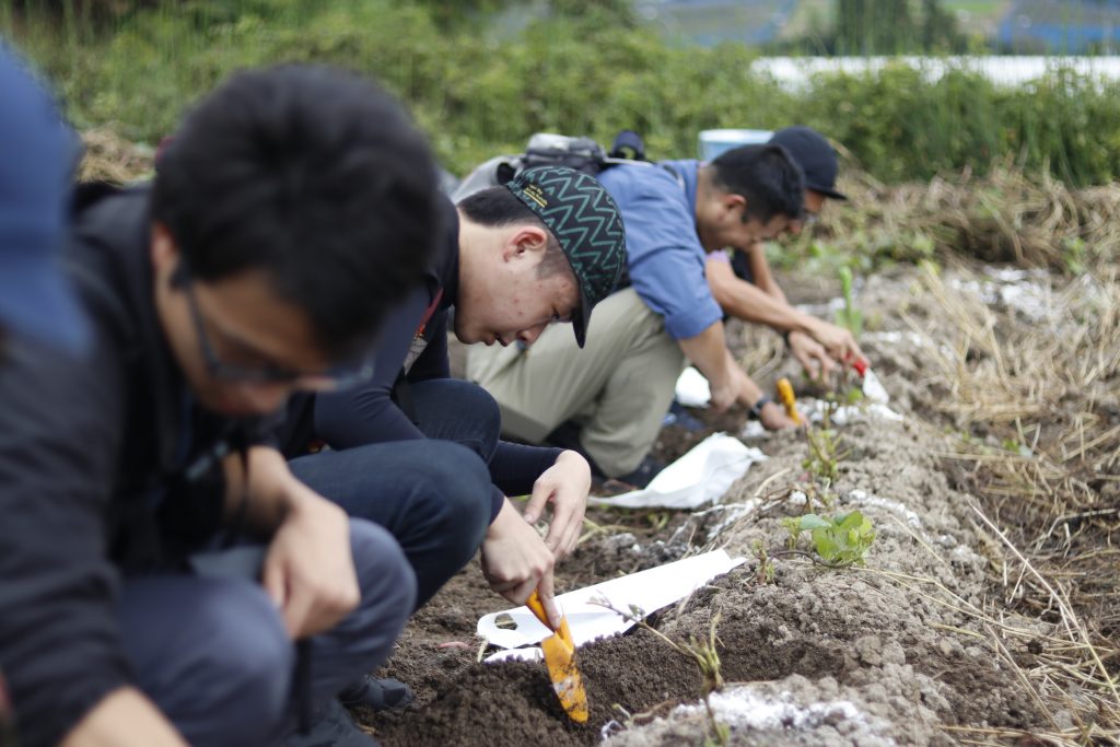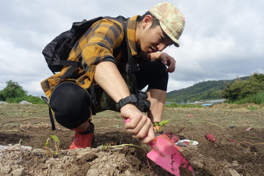 場所が決まったら、早速、横一列で芋ほりスタート!(スコップは無料で貸してくれます)