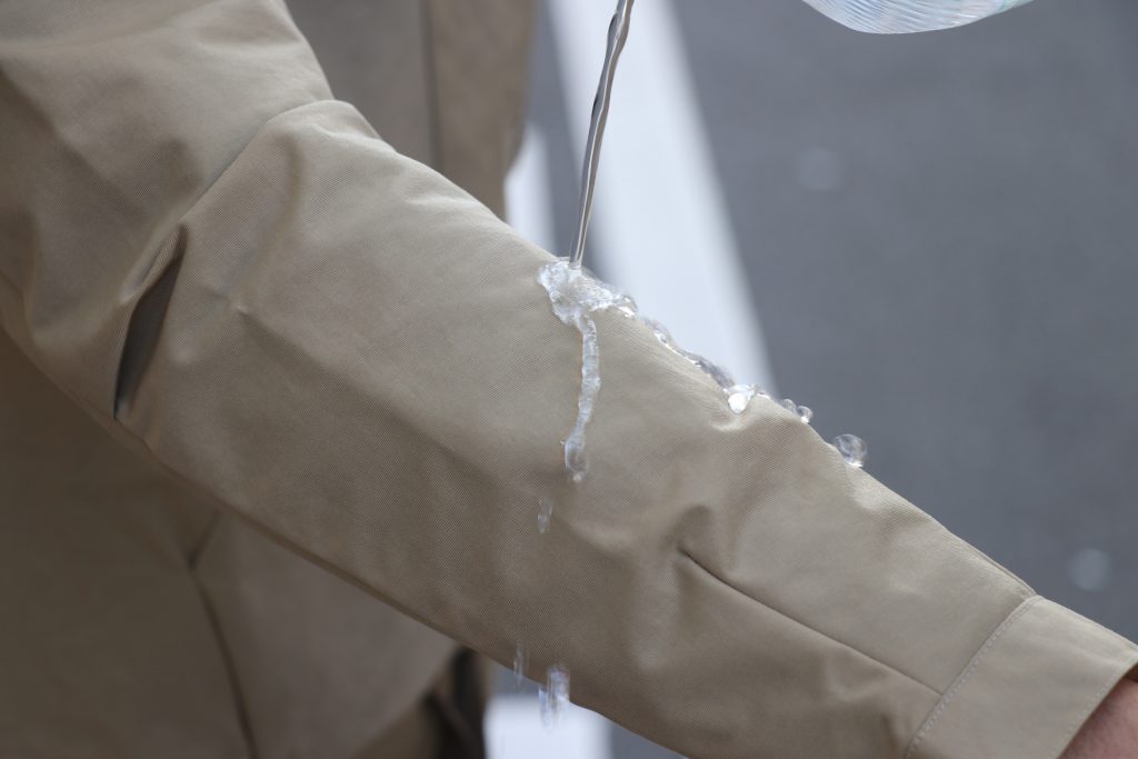 コットンライクな表情の生地ですが、ご覧の通りレインウェアとして使えるレベルの防水性があり、透湿性も備わっているので