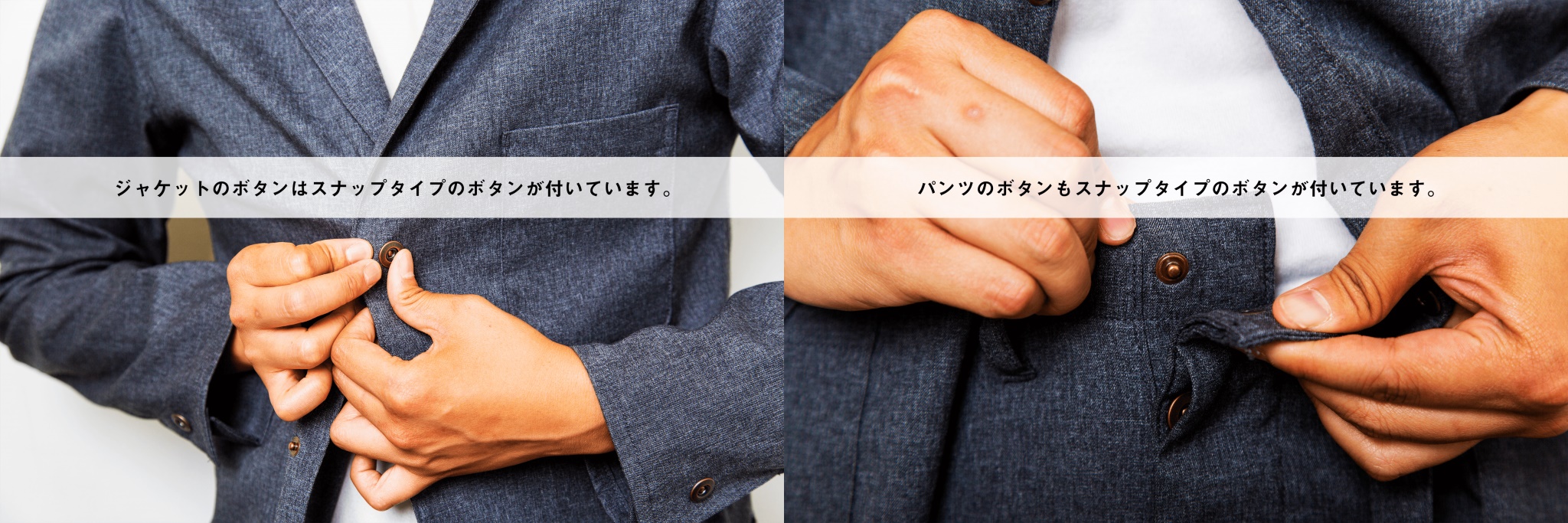 ジャケット&パンツのどちらもスナップボタンと着脱も楽々◎
