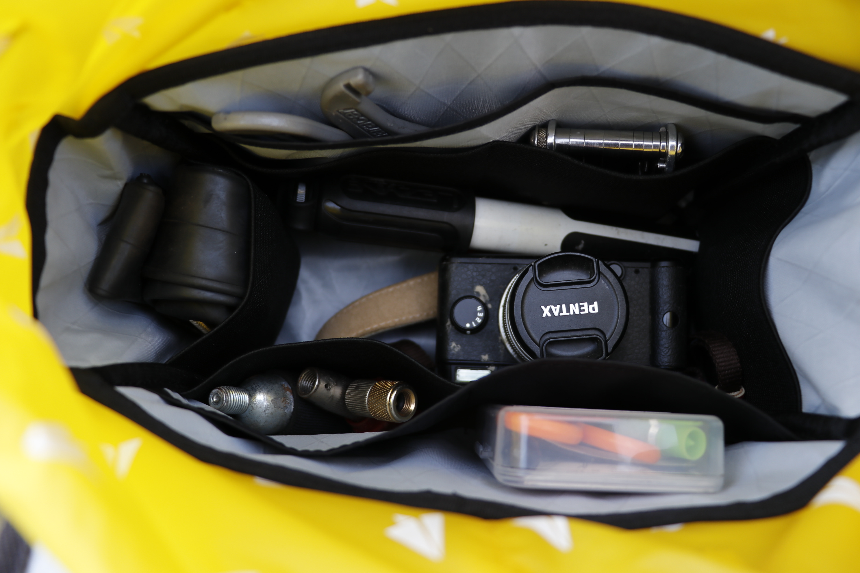 ちなみに中央に縦にジップが付いているのがサブバッグなのですが、ヘッドチューブに当たり、メインバッグが荷物の重みで垂れ下がる=おじぎしてしまうのを防いでいます。