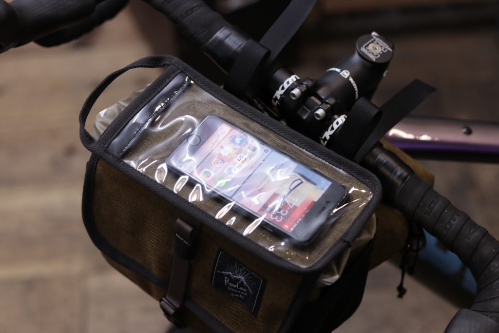 トップにはタッチパネル対応のスマホケースを配置。サッと地図を見たりすることも可能ですし、何よりも”ライド中でも着信にすぐ気付ける”というのは大きなメリット◎