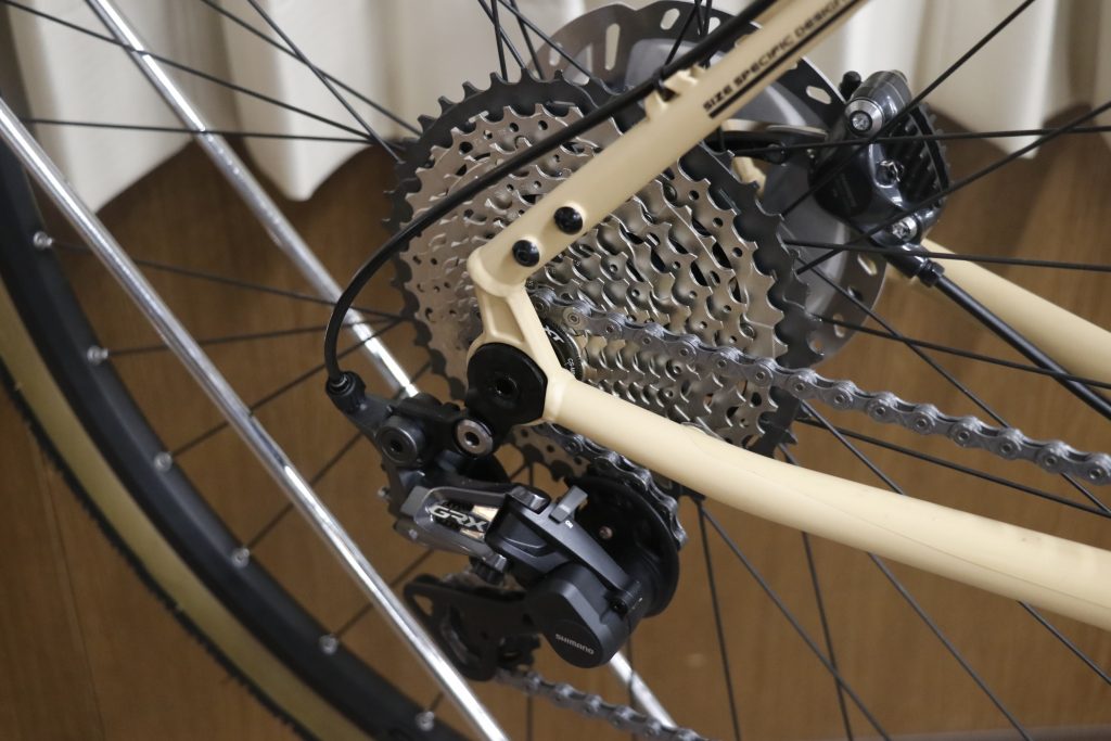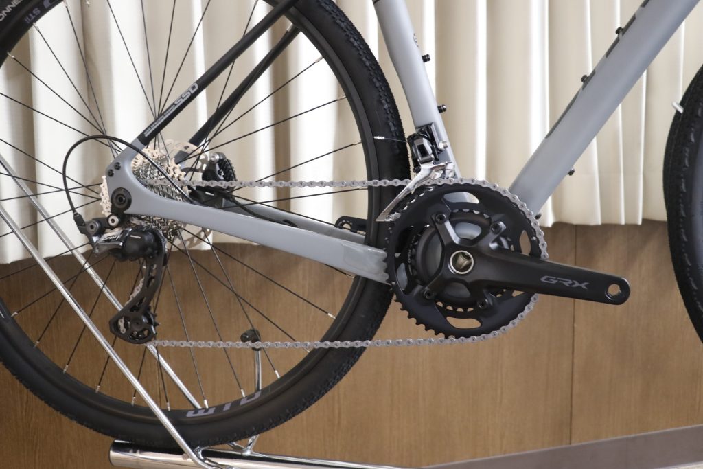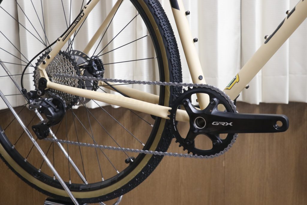 コンポはShimano GRX 800系の1×11speed. フロントシングル 40T×リア 11-42T でワイドレシオをカバーした仕様です。