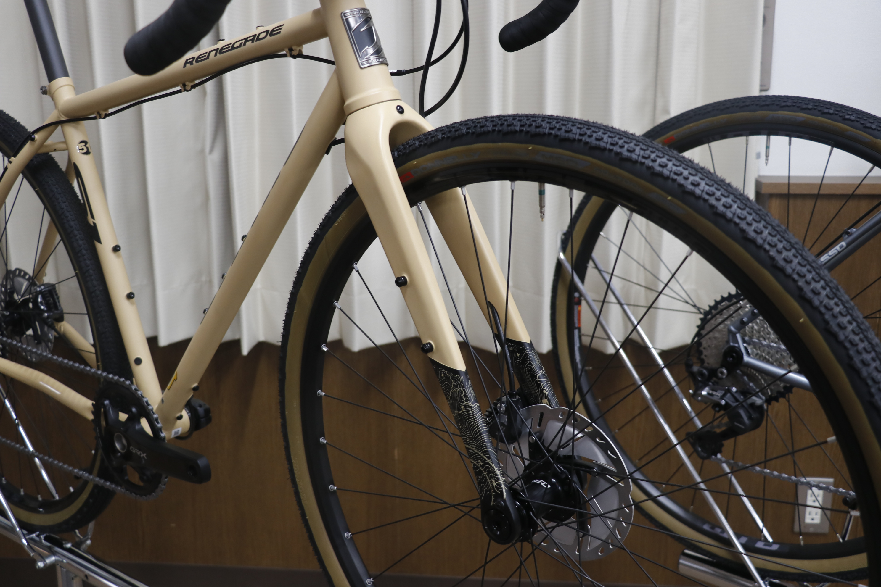 カスタムバイクの様に贅沢なホイールが最初から付いてきます。フレーム&フォークも然ることながら、RENEGADE S1の走りの軽さはこのホイールに因るところも大きいです。