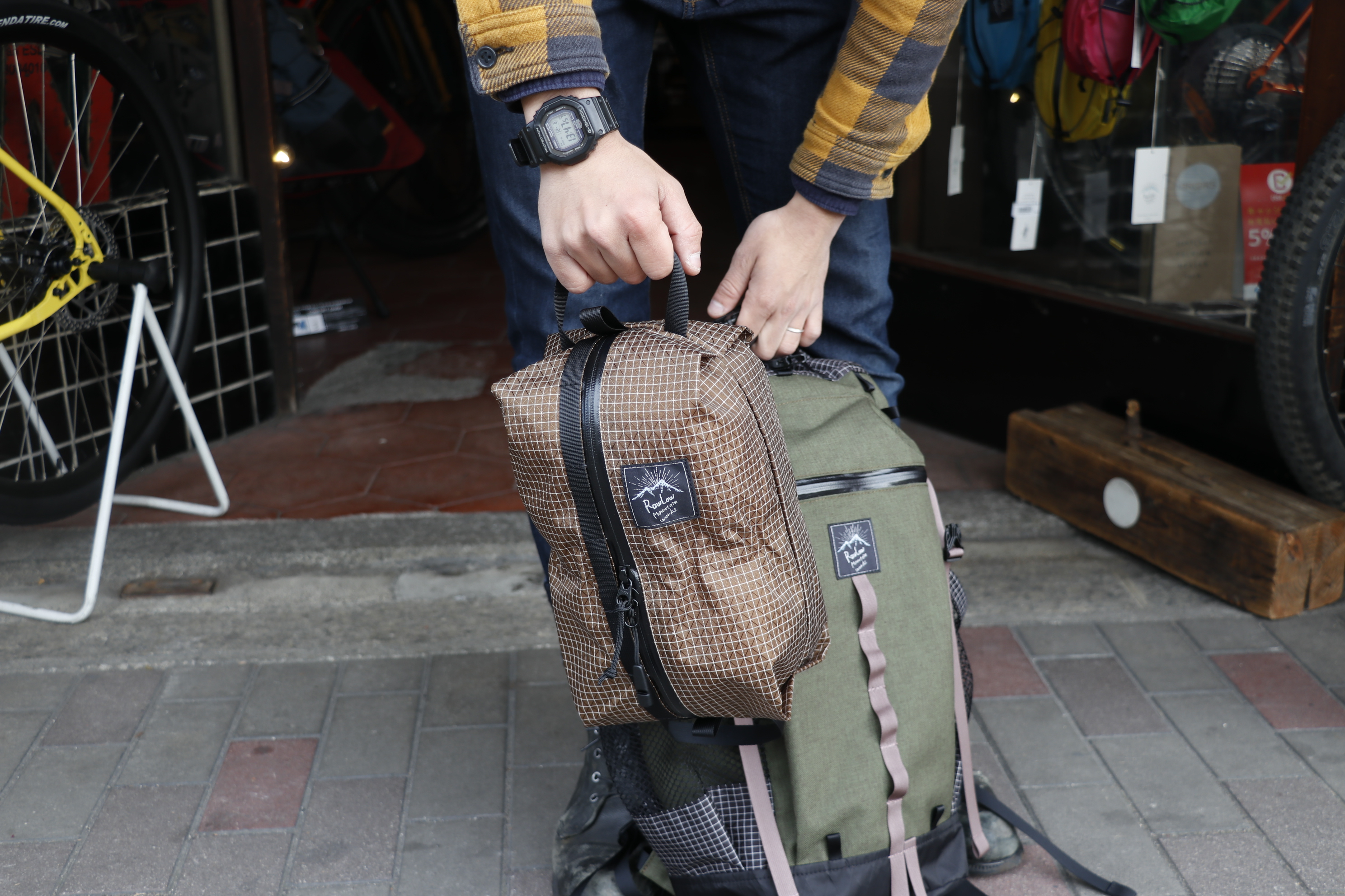 中央にデイジーチェーンが配されたロウロウマウンテンワークスの「ストレージサック」。コレ、一つ持っているとホント何かと便利なのです!