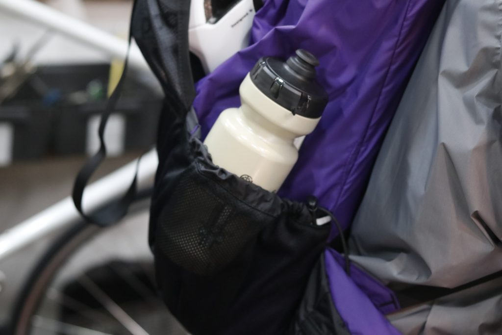 サイドのメッシュポケットはサイズも大きく・マチも設けてあるので、サイクリングボトル等固い物も出し入れしやすい使い勝手の良さ。