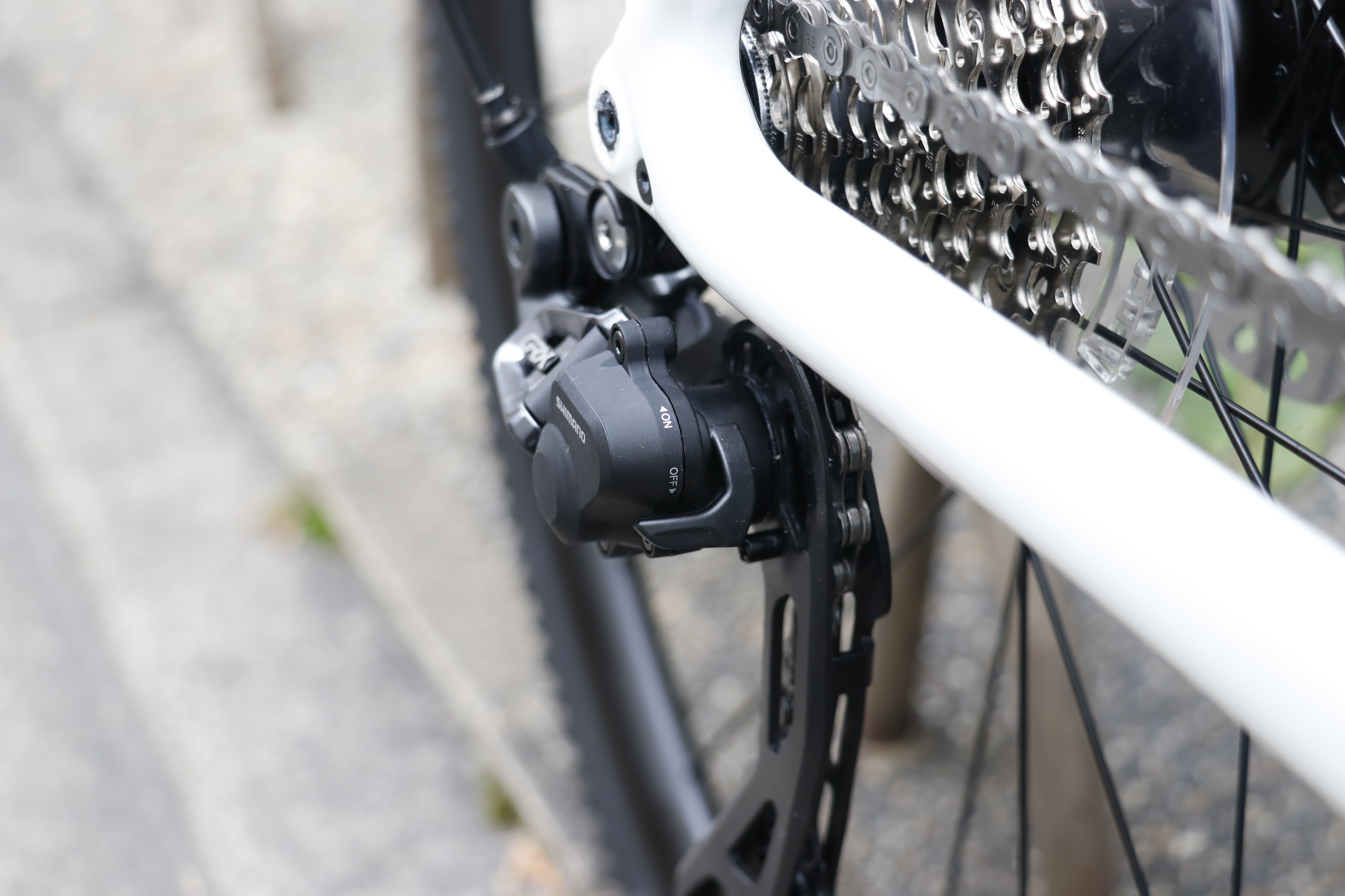 チェーン落ち等のトラブルはスタビライザー付きのリアディレイラーでOK◎ スイッチ付きでスタビライザーのON/OFFが選べるのでグラベルに入る前に忘れず、ONにしておけば安心ですね!