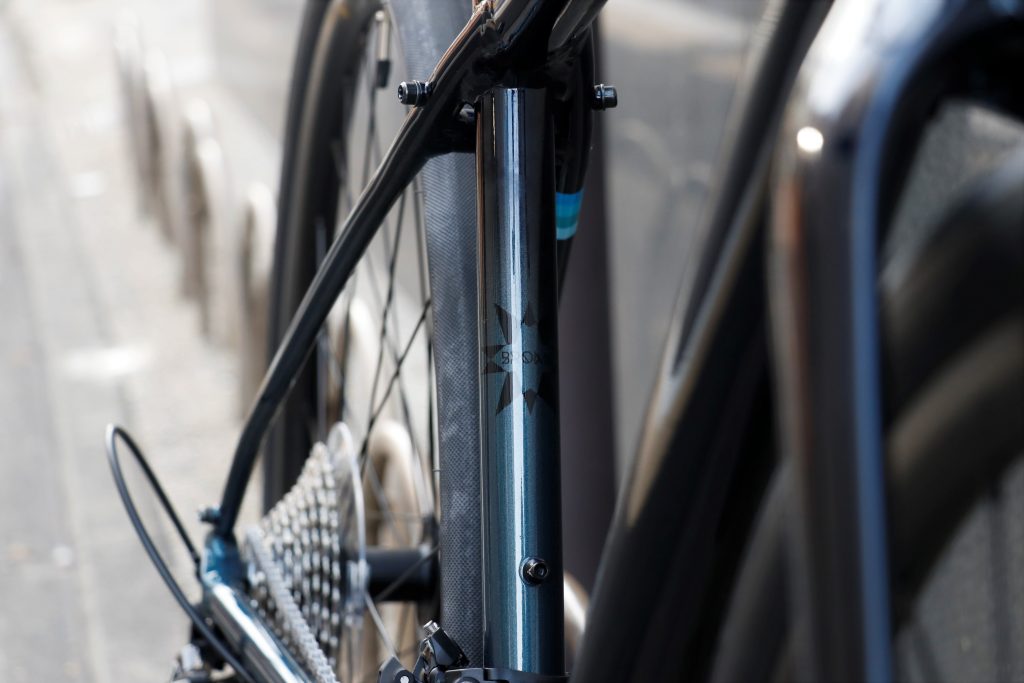 勿論、クロモリのフレームには細身のルックスであったり、タフさであったりとメリットもありますが、走りの軽やかさという点ではアルミフレーム/カーボンフォークというのはかなり重宝します◎