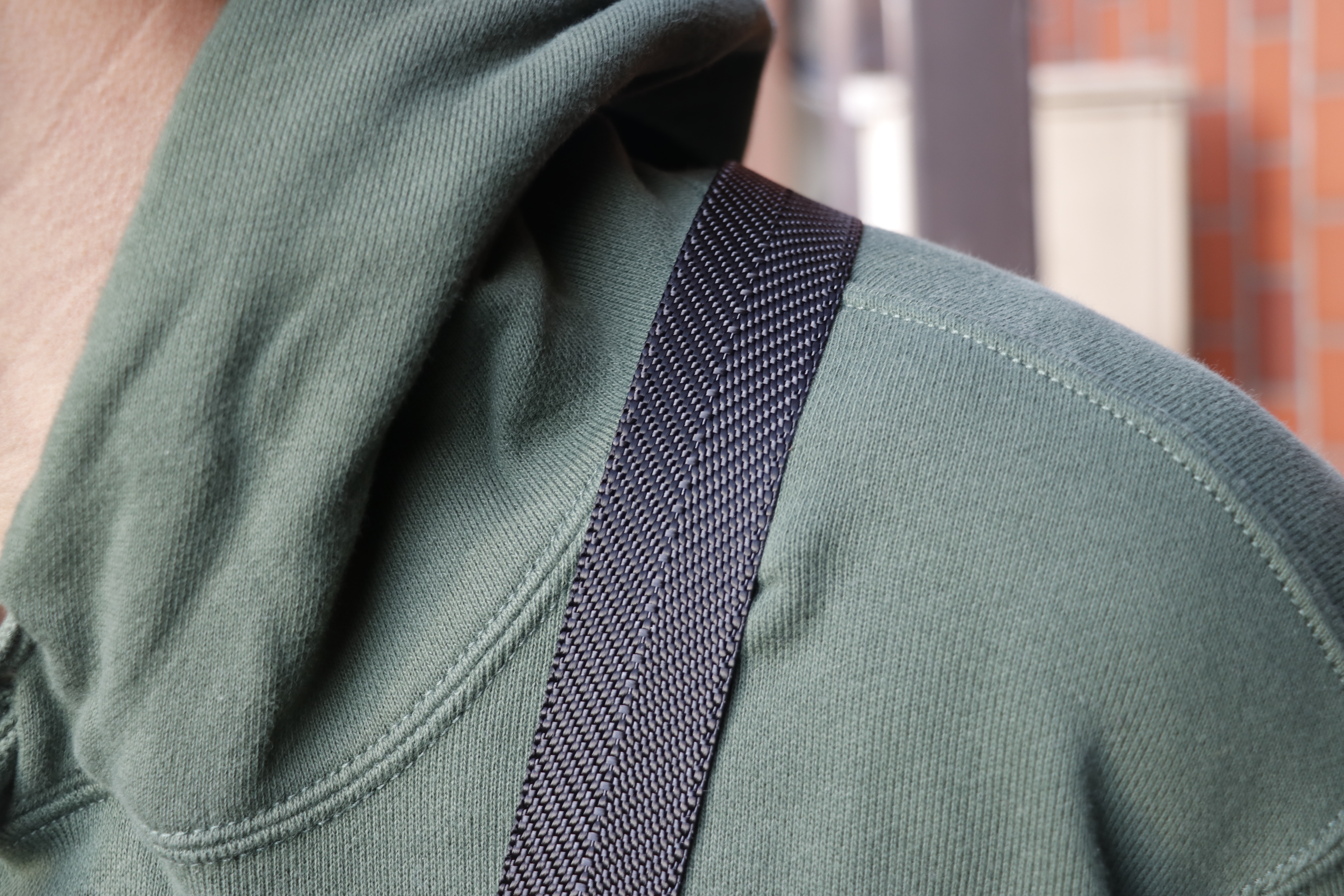 従来は15mmの細目のナイロンベルトでコンパクトでしたが、新型のストラップは同社のCAMERAKITと同様の30mmの太目&編み込みナイロンで担いだ時に肩に優しくなっております!