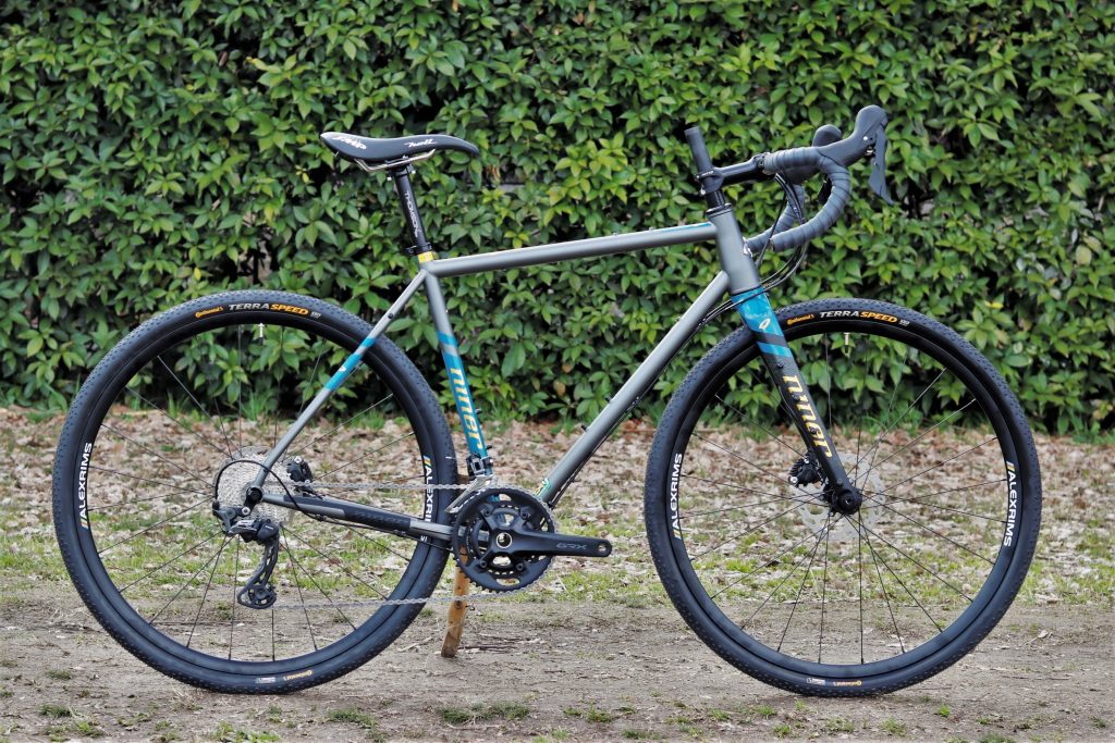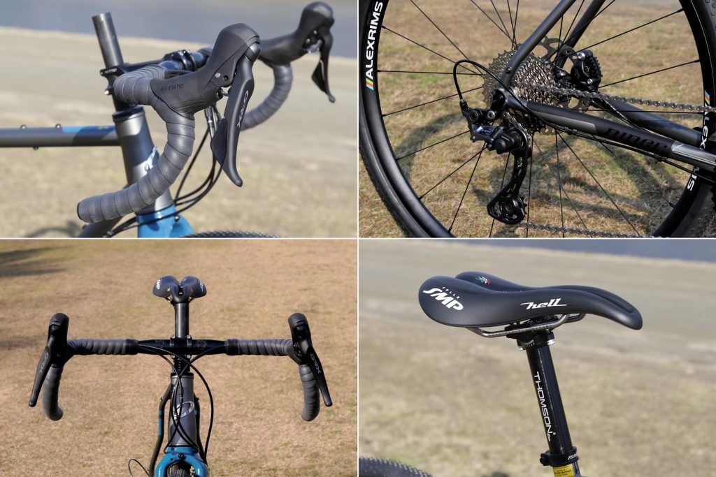 本完成車は、shimano GRX(810-600-400のミックス) 2×11スピード 油圧ディスクブレーキコンポーネントをメインに、足回りは・ホイール:ALEXRIMS チューブレスレディ、・タイヤ:タイヤContinental TERRA SPEED 700x40c、ステムにはCNC加工が美しい日東UI-25、ハンドルには同じく日東M137 520mmのワイドタイプ、シートピラーには名作THOMSON ELITE、サドルにはSELLE SMP のHELLと、実に価格抑えながらも所有満足度高い構成でアッセンブルされております。