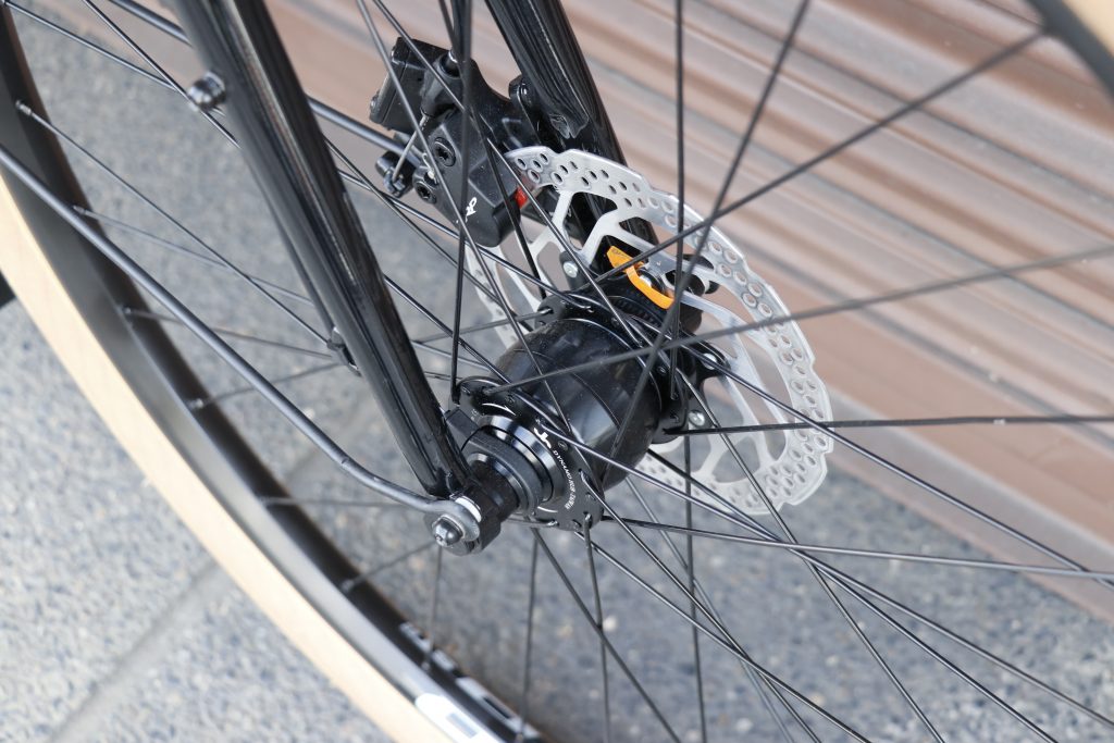 前車輪軸(ハブ)の回転に合わせ発電~夜間自動で点灯する「ハブダイナモ ライト」が標準装備された本モデル。