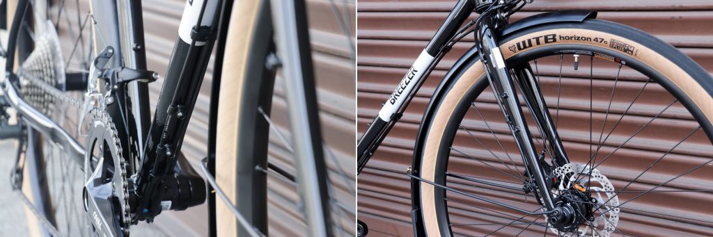 標準タイヤには、 WTB Horizon, 650×47mmが採用。650B×47Cは700×28Cとほぼ同じ外径となるが、倍近いエアボリュームが得られることになり、パンクリスクの軽減は勿論、荷物積載時の安定性、グラベル~林道での高い走破性が特徴。