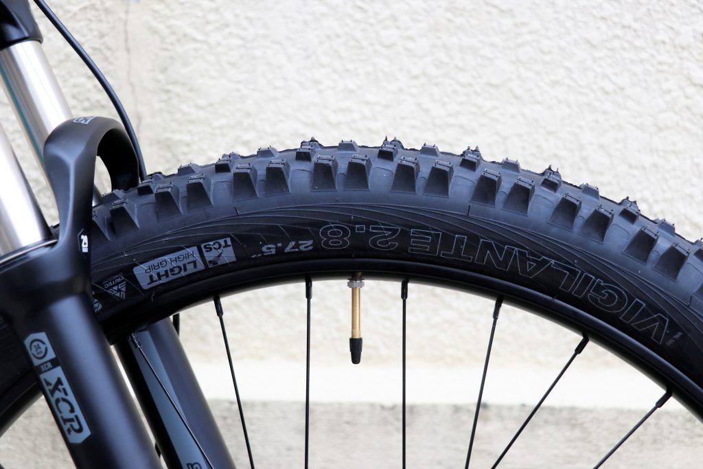 標準採用タイヤは、山中現れる木の根や岩のギャップもスムーズに走破する27.5インチ+(プラス)規格のWTB製 Vigilante TCS(ヴィジランテ TCS)。
