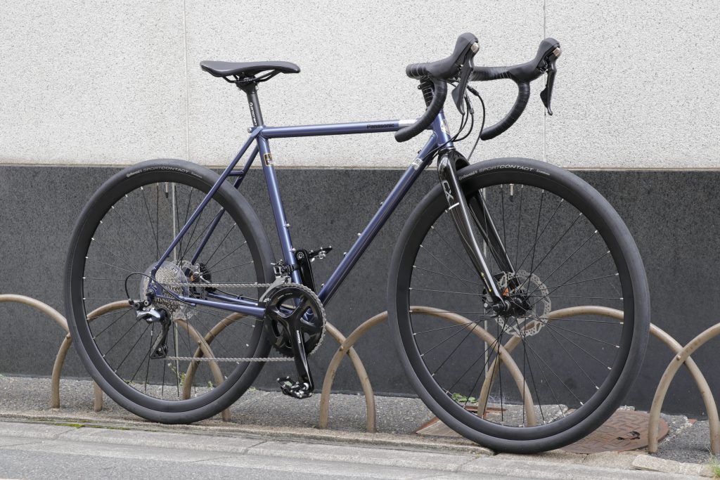 フレーム単体販売となる本モデルに、SHIMANO 105 油圧ディスクブレーキをベースとしたパーツ構成。普段のデイリー~荷物を積んだツーリングをベースとした使用をご要望との事で、ロードバイクに比べタイヤクリアランスの広いシクロクロスの特性を活かして35Cスリックタイヤを装着。