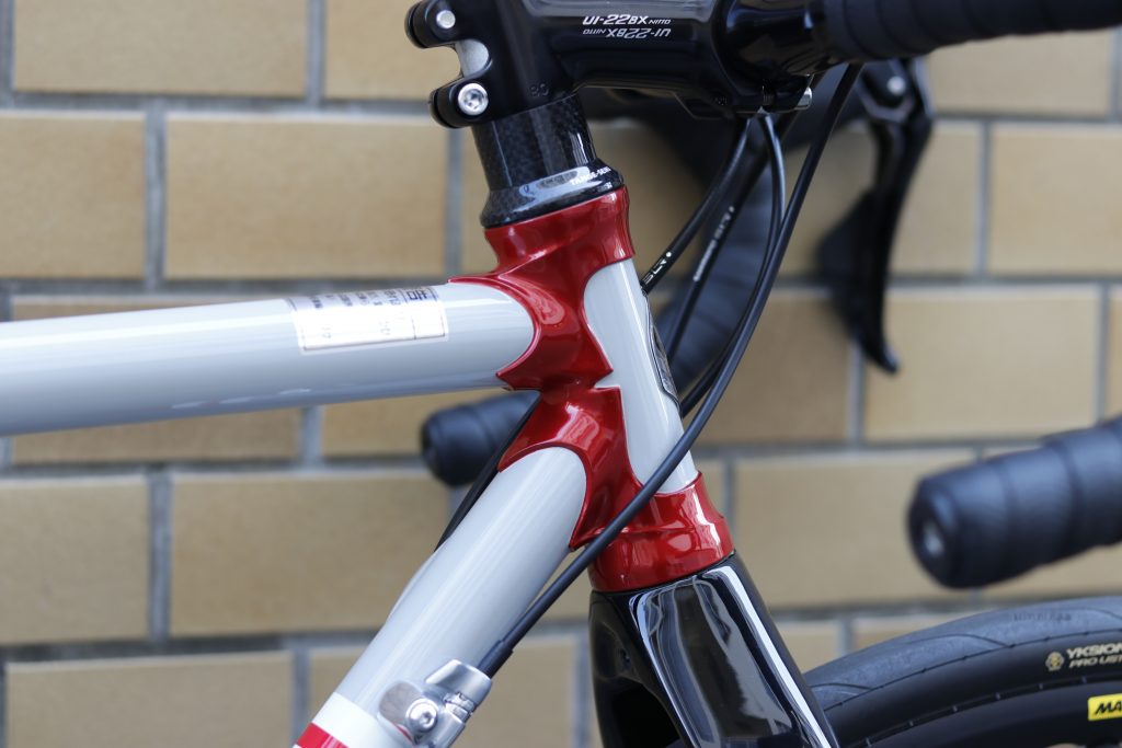 ダウンチューブ~トップチューブは当時のフレームよりも一回り太い31.8mm径を設定し、クロモリのしなやかさと絶妙なバネ感に併せ普通のクロモリよりも高い剛性感が魅力。